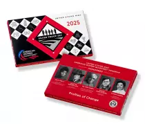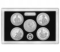 Ce coffret numismatique contient des pièces de monnaie émises par les États-Unis d'Amérique. Chaque pièce a une valeur nominale exprimée en quarts de dollar, bien que l'unité monétaire spécifique ne soit pas précisée dans les données fournies. L'émission de ces pièces est prévue pour l'année 2025.