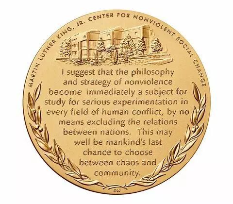 Cette médaille honore le Dr Martin Luther King, Jr. et son épouse Coretta Scott King pour leurs nombreuses contributions à la nation au nom du mouvement des droits civiques. Il s'agit d'une copie en bronze de la médaille d'or du Congrès décernée à titre posthume par le président Obama - au nom du Congrès - au Dr Martin Luther King, Jr. et à Coretta Scott King. King a prononcé son discours « I have a dream » devant le Lincoln Memorial plus de 50 ans plus tôt, le 23 août 1963.