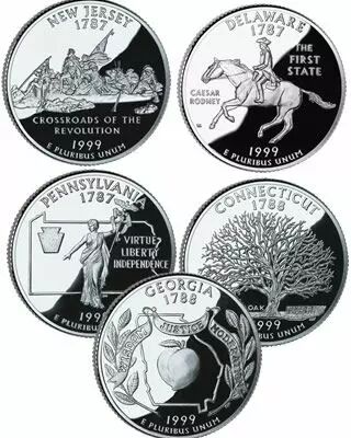 Série : 50 State Quarters".Etats commémorés en 1999 : Connecticut Georgie New Jersey Pennsylvanie Delaware.