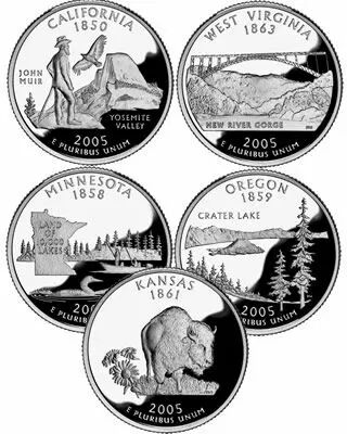 Série : 50 State Quarters".Etats commémorés en 2005 : Minnesota Virginie Californie Kansas Oregon.