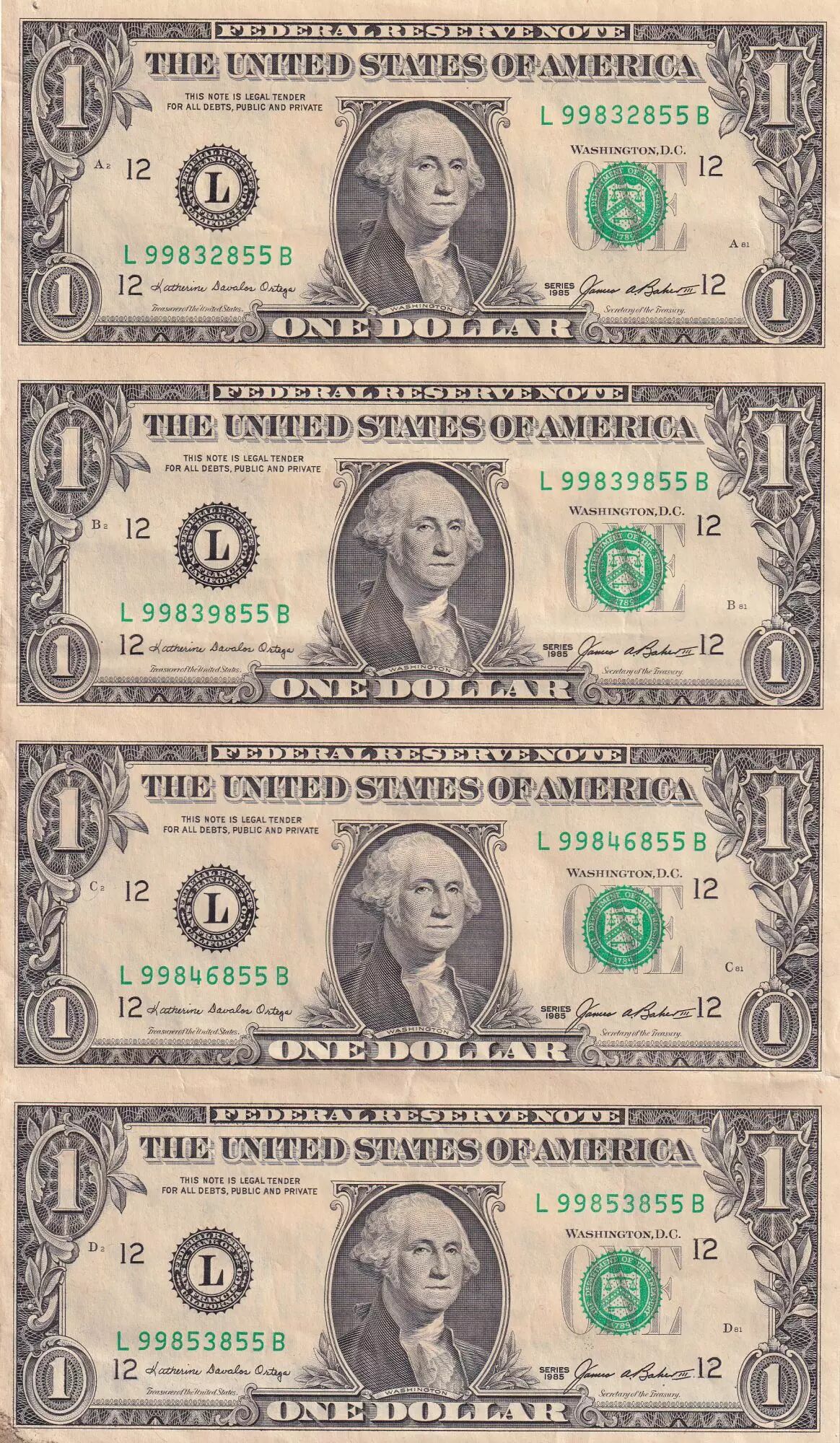 Home > > USA Sheet of 4 banknotes of 1 Dollar - George Washington - 1985 - San Francisco (L)
