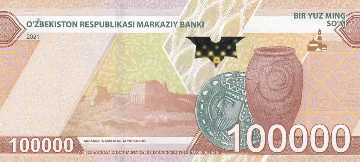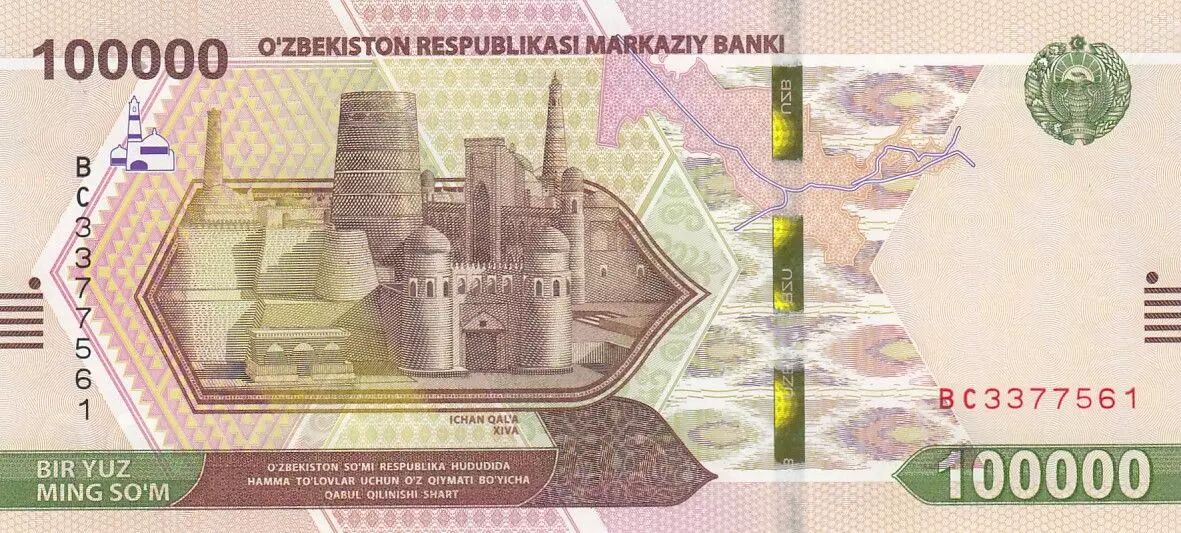Home > World Banknotes > Asian Banknotes > Uzbekistan > Uzbekistan 100.000 Som - Ichan Qal'a Museum in Khiva, Khorezm - 2021 - P.92a