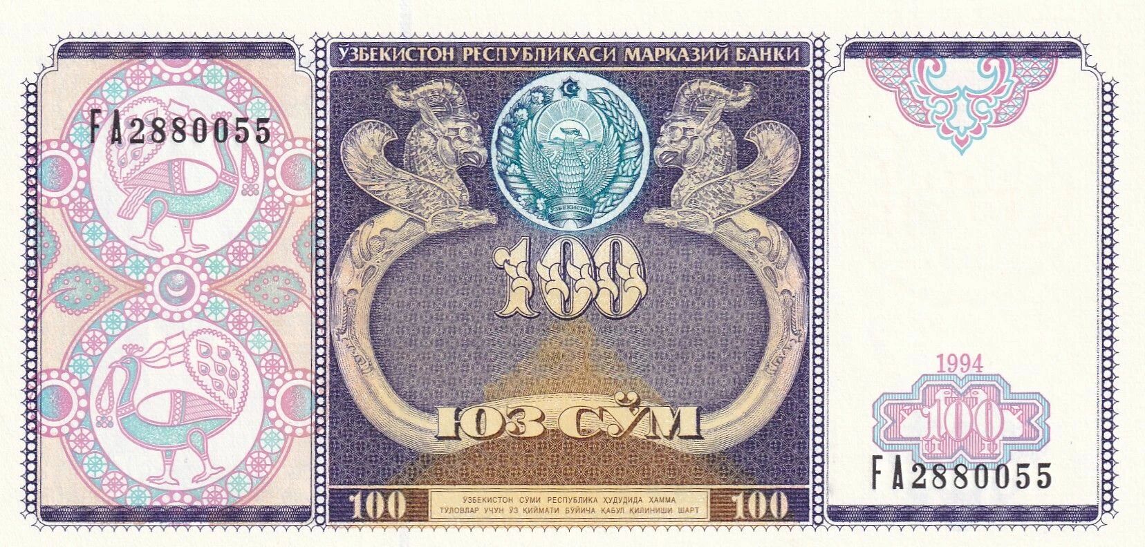 This banknote comes from Uzbekistan and was issued in 1994. It belongs to the FA series and has a face value of 100 sums.