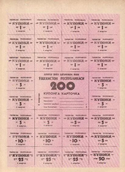 Home > World Banknotes > Asian Banknotes > Uzbekistan > Uzbekistan 200 Coupons 1993 - Sheet of 28 Coupons, pink