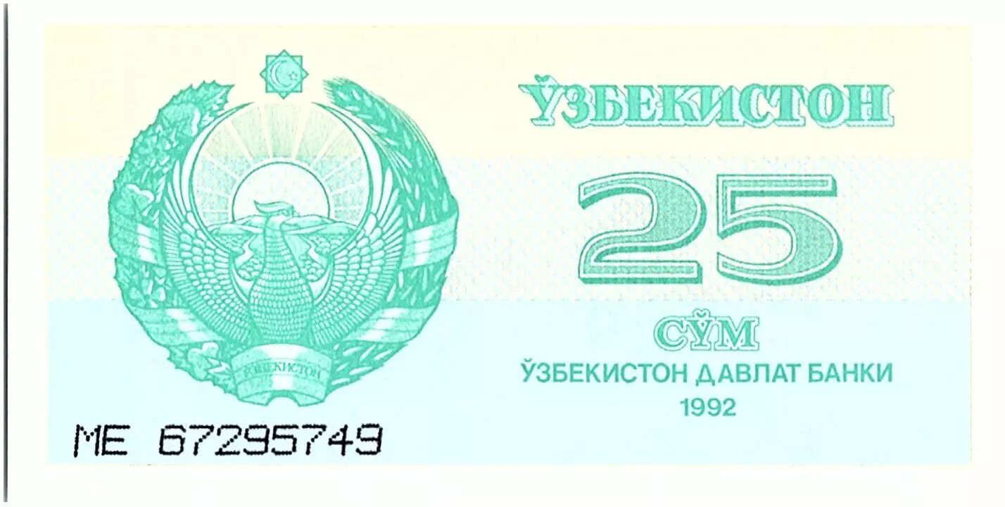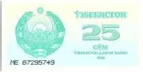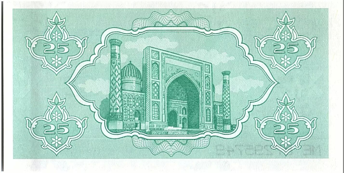 Banknote Uzbekistan 25 Sum, Arms - Mosque - 1992 - P.65