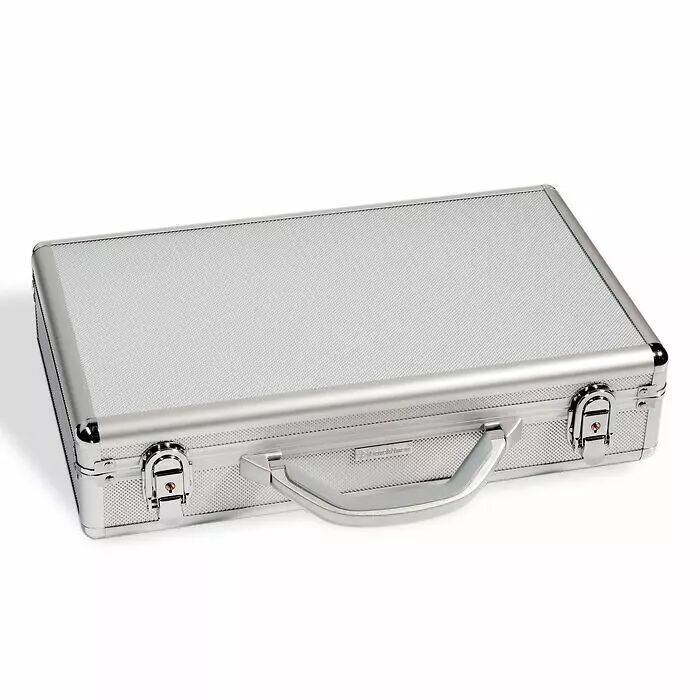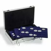 Valise numismatique en aluminium avec 6 plateaux pour toutes les pièces courantes. Intérieur entièrement recouvert de velours bleu-marine, très maniable pour retirer les pièces, fermant à clé (2 clés).