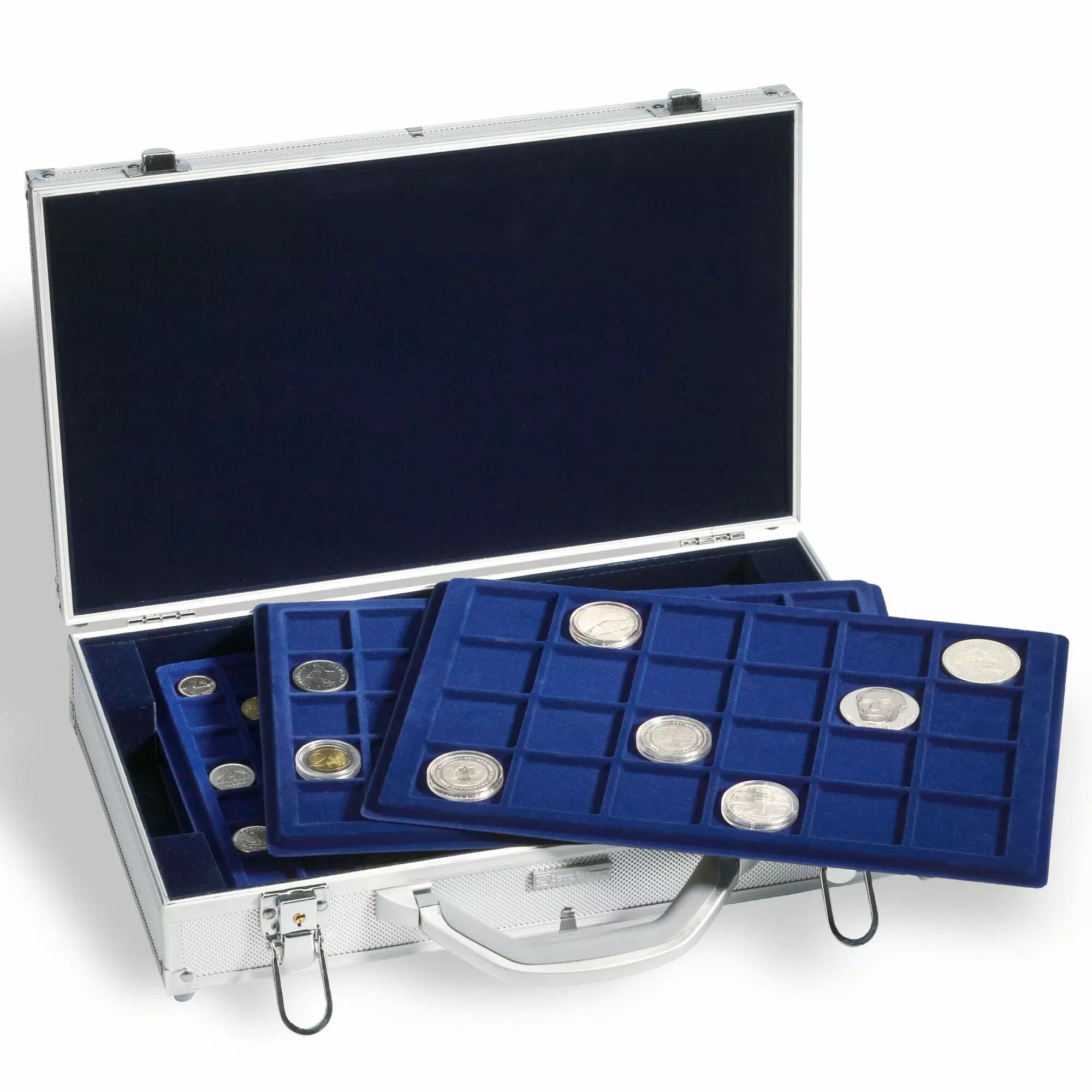 Valise numismatique CARGO L6 pour 240 pièces jusqu'à 33 mm de diamètre (par ex. pièces de 2 euros en capsules). Comprend 6 plateaux pour 40 pièces chacun.