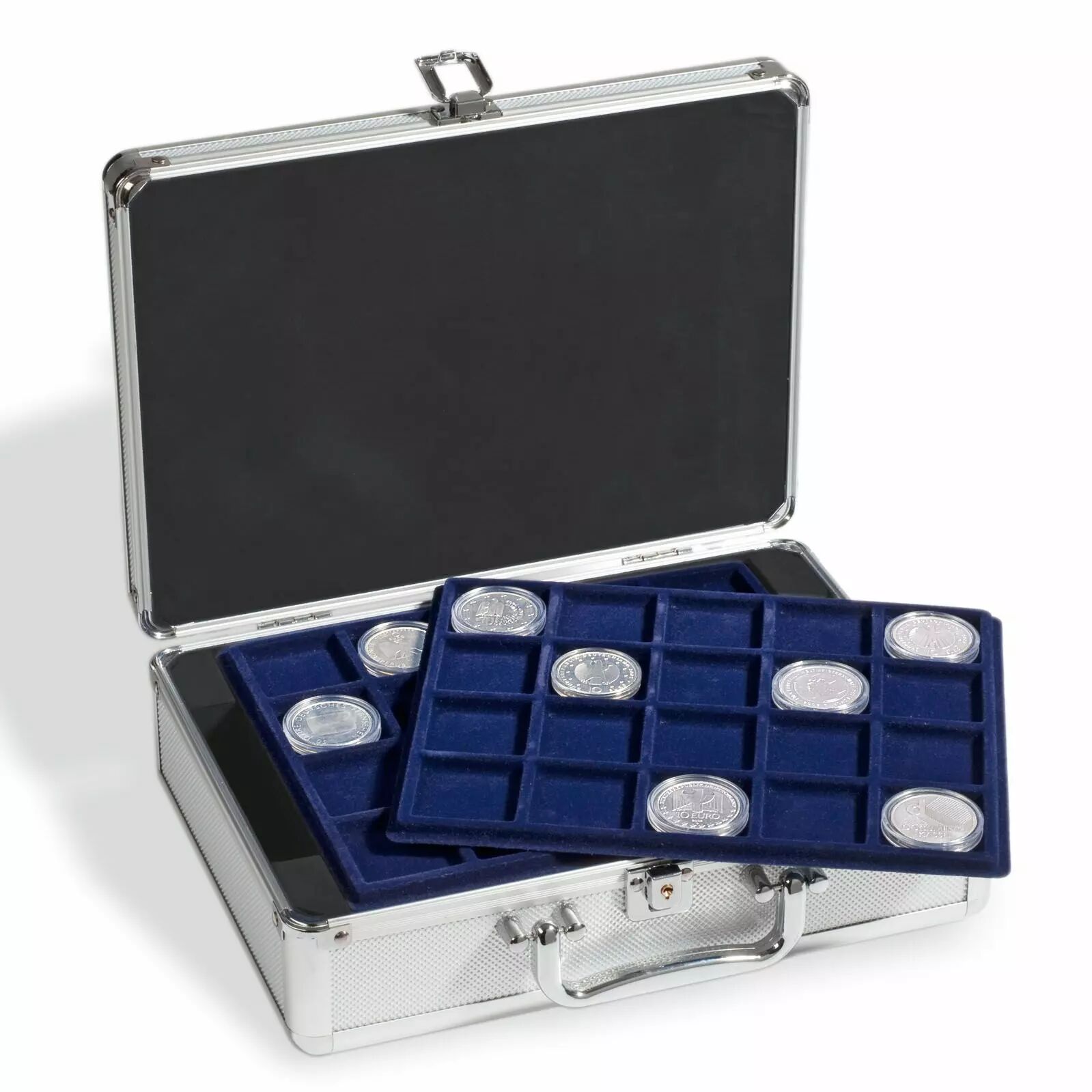 Valise numismatique CARGO S6 comprenant 6 plateaux avec couvercle soigneusement capitonné. Intérieur recouvert de velours bleu. Fermoir (2 clés). Coins en métal. Pieds en caoutchouc.