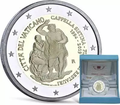 Cette pièce commémorative de 2 euros a été émise par le Vatican en 2019. Elle célèbre le 25e anniversaire de la restauration de la chapelle Sixtine.