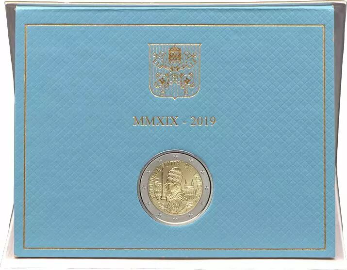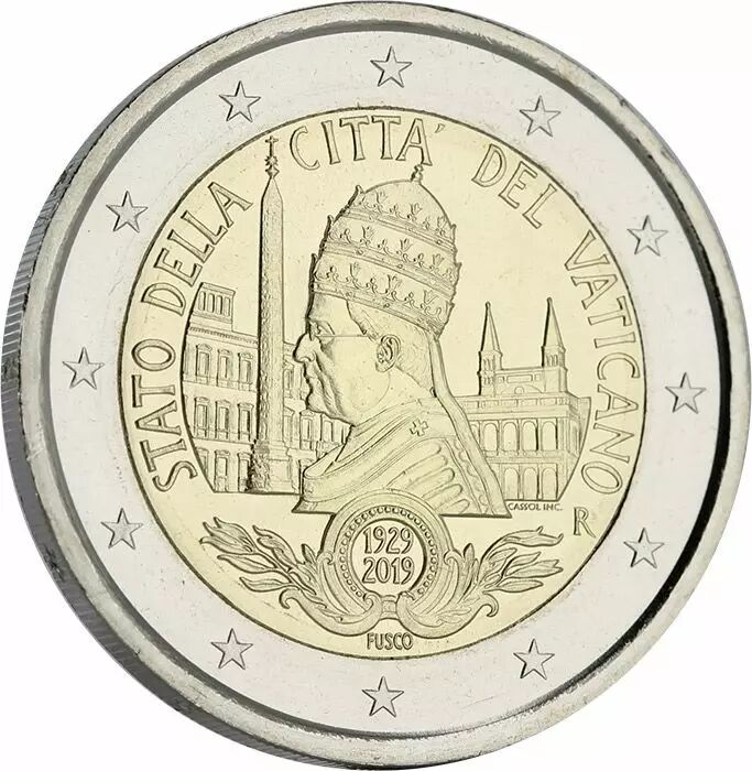 La pièce commémorative de 2 euros émise par l'État de la Cité du Vatican en 2019 célèbre le 90e anniversaire de la fondation de l'État du Vatican. Cette pièce est frappée en qualité BU (Brillant Universel).
