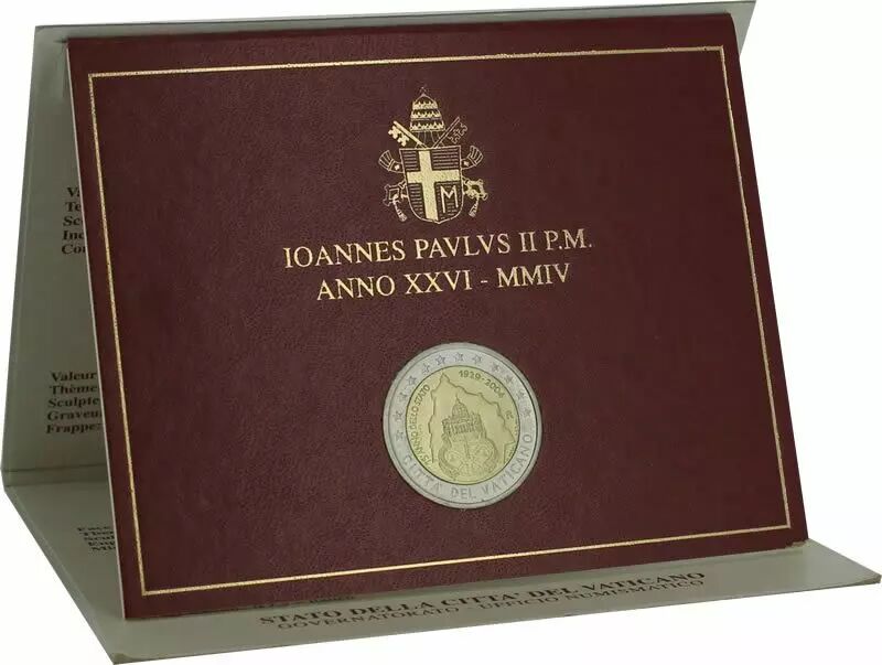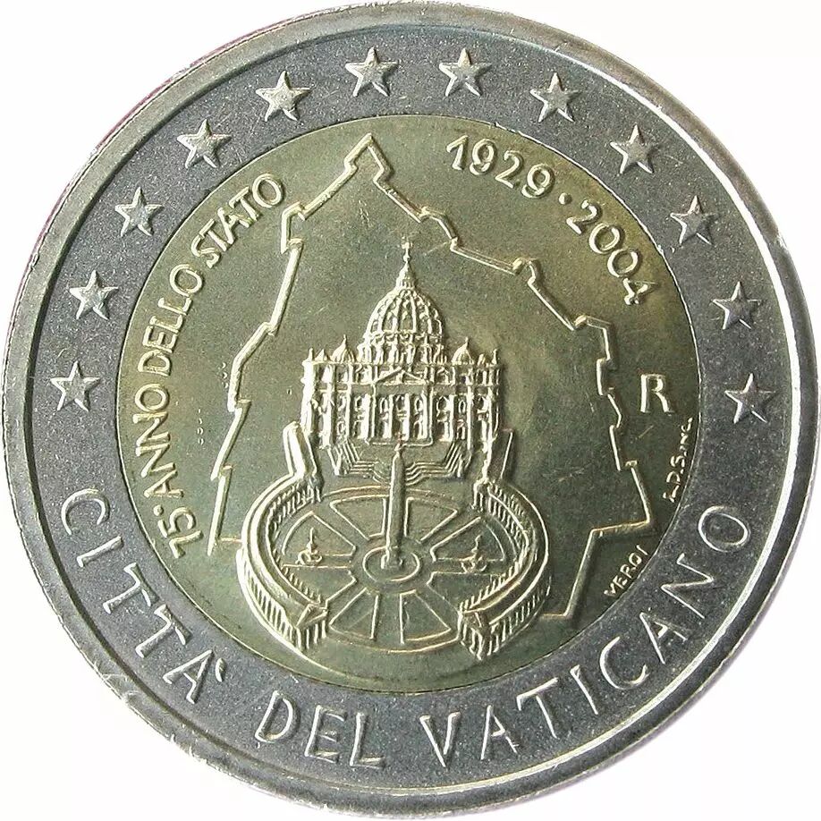 La pièce commémorative de 2 euros du Vatican, émise en 2004, souligne le 75e anniversaire de la fondation de l'État de la Cité du Vatican, qui s'est déroulée en 1929.