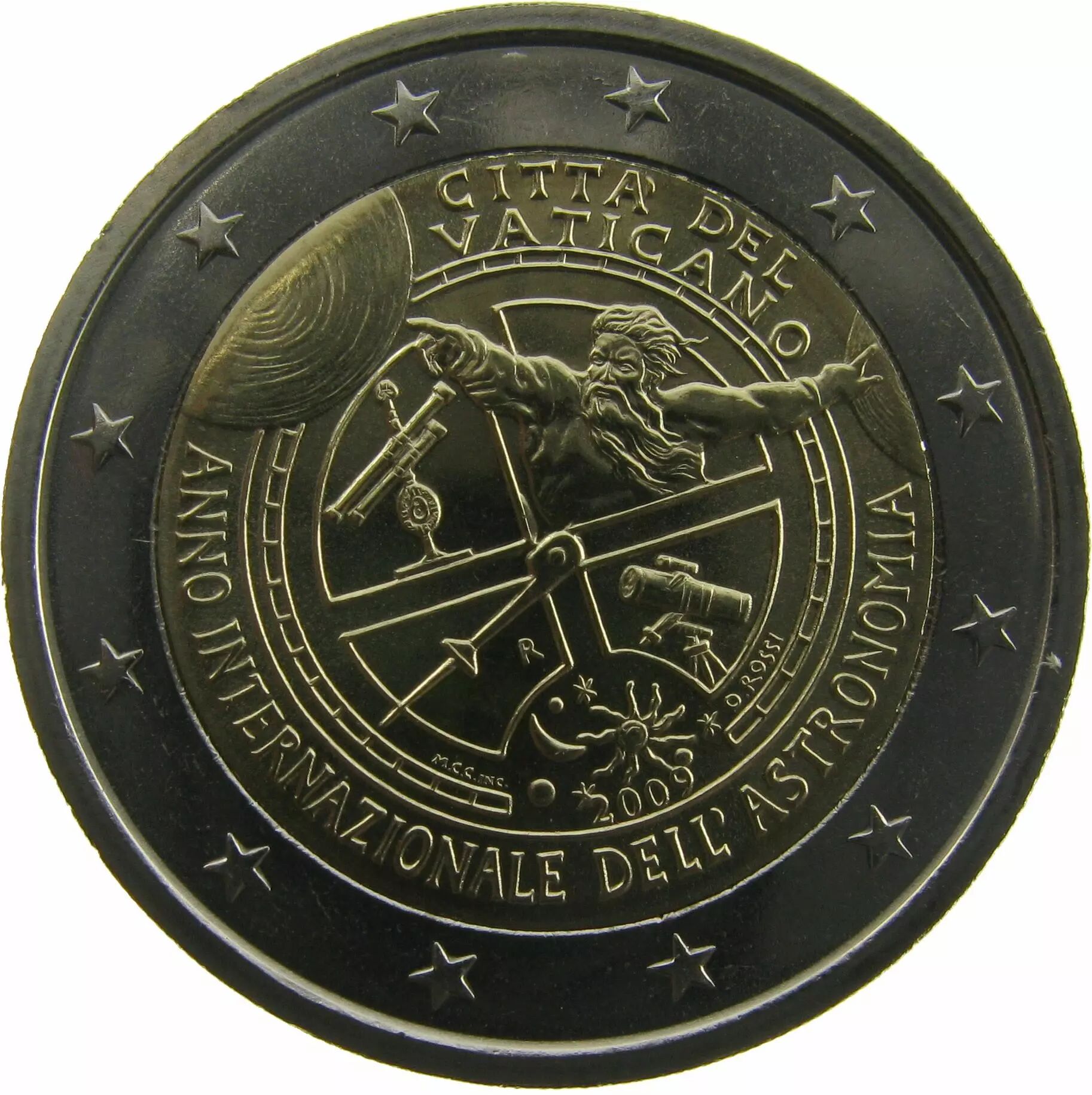 Cette pièce commémorative de 2 euros a été émise par le Vatican en 2009 pour célébrer l'Année Internationale de l'Astronomie. Frappée en qualité UNC (Uncirculated), elle est présentée dans son blister officiel, assurant sa protection et son authenticité.