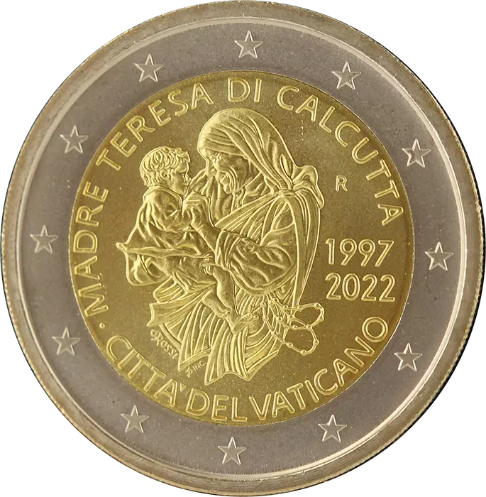 This 2 euro commemorative coin, issued by the Vatican in 2022, marks the 25th anniversary of the death of Mother Teresa of Calcutta. Struck with a Brilliant Uncirculated quality, it is intended for collectors and numismatists.