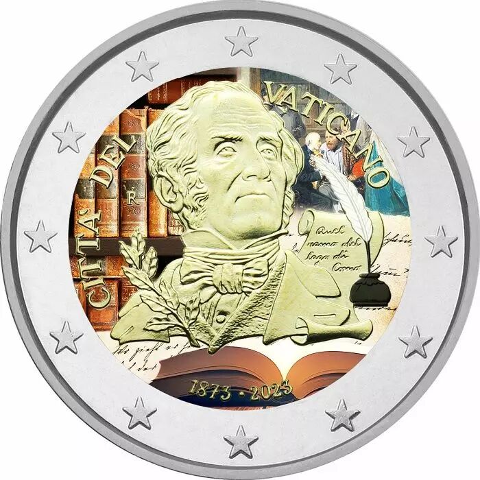 2023 marks the 150th anniversary of the death of Alessandro Manzoni, one of the most important writers in Italian literature. The Vatican State Mint is celebrating this anniversary by issuing a bi-metallic €2 coin (in both the BU and BE versions). The €2 coin is designed by artist Gabriella Titotto and depicts Manzoni's portrait in the centre, with his signature underneath; on the right, behind the inkwell and quill, are the first words of his famous historical novel "I Promessi Sposi" (The Betrothed). On the left, a laurel branch testifies to the enduring fame of the great writer.