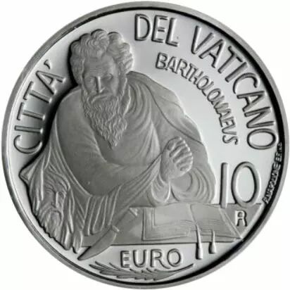 This year's €10 silver coin is dedicated to the apostle Bartholomew. Originally from Cana in Galilee, tradition tells of his life as a missionary in the Middle East. According to the few reports that have come down to us about him, he was flayed alive and beheaded around the middle of the first century in Armenia. On the reverse of the coin, our artist Antonella Napolione depicts the apostle with his hands folded and his gaze turned downwards where, next to the Gospel, is a knife symbolising his martyrdom. On the left of the coin, the skin and features of his suffering face are depicted.
