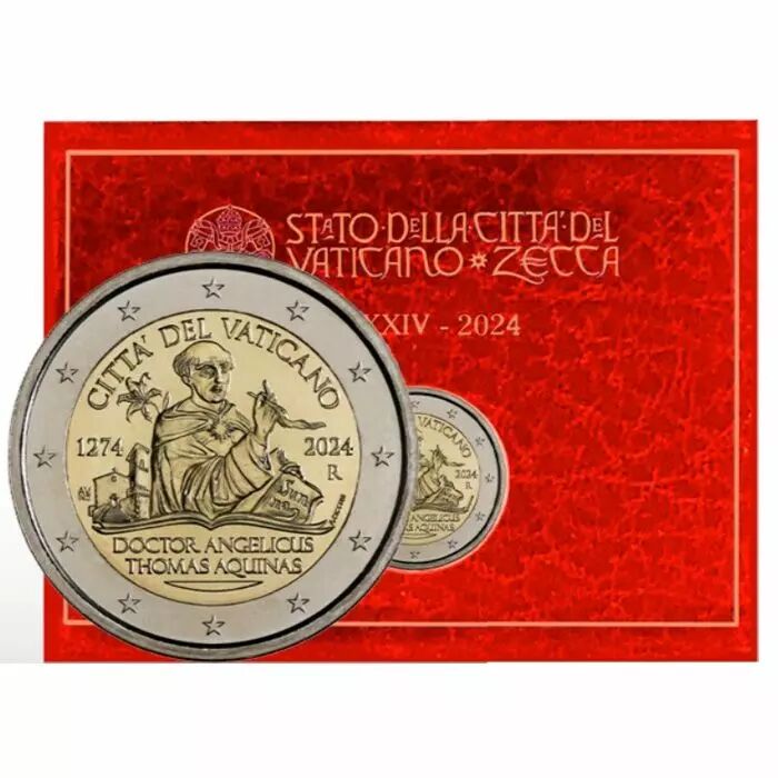 This 2 euro commemorative coin, issued by the Vatican in 2024, celebrates the 750th anniversary of the death of Saint Thomas Aquinas.