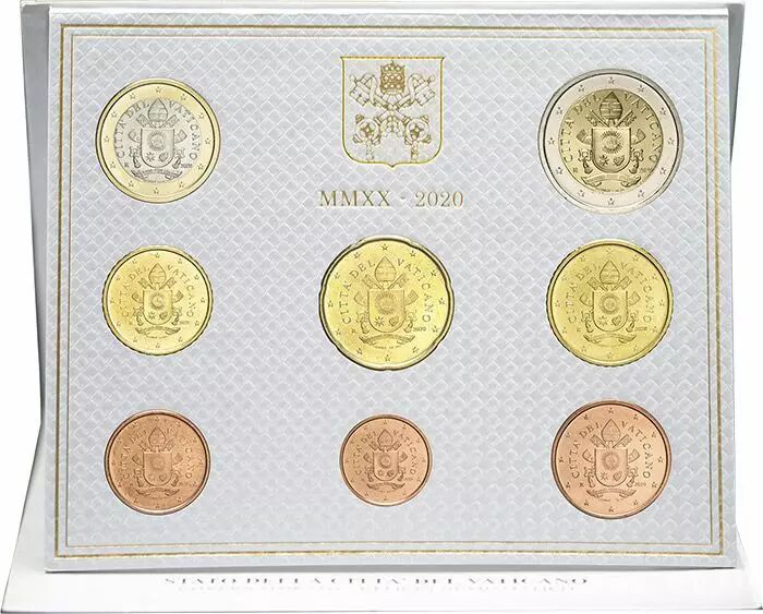 Contains 8 coins from 1 cent to 2 euros in the year 2020. Coat of arms of Pope Francis.