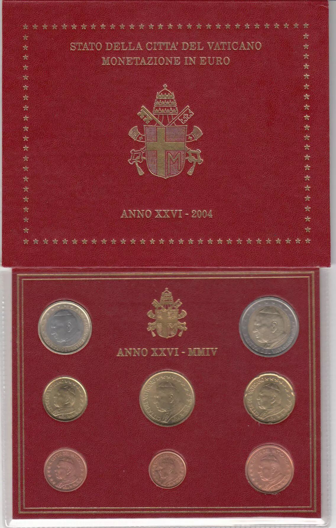 Série en coffret officiel BU 2004 du Pape Jean-Paul II comprenant les 8 pieces 1 centime à 2 euros.