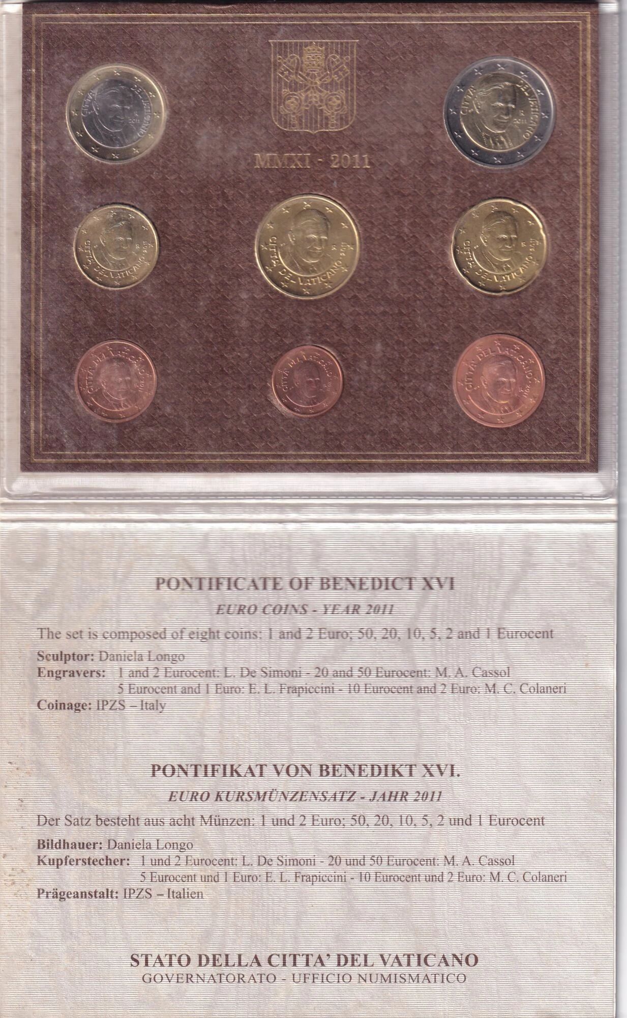 La série de huit pièces en euros du Vatican, émise en 2011, présente l'effigie du Pape Benoît XVI. Chaque pièce, de la 1 centime à la 2 euros, arbore un design distinctif tout en partageant un thème commun lié à la papauté de Benoît XVI.