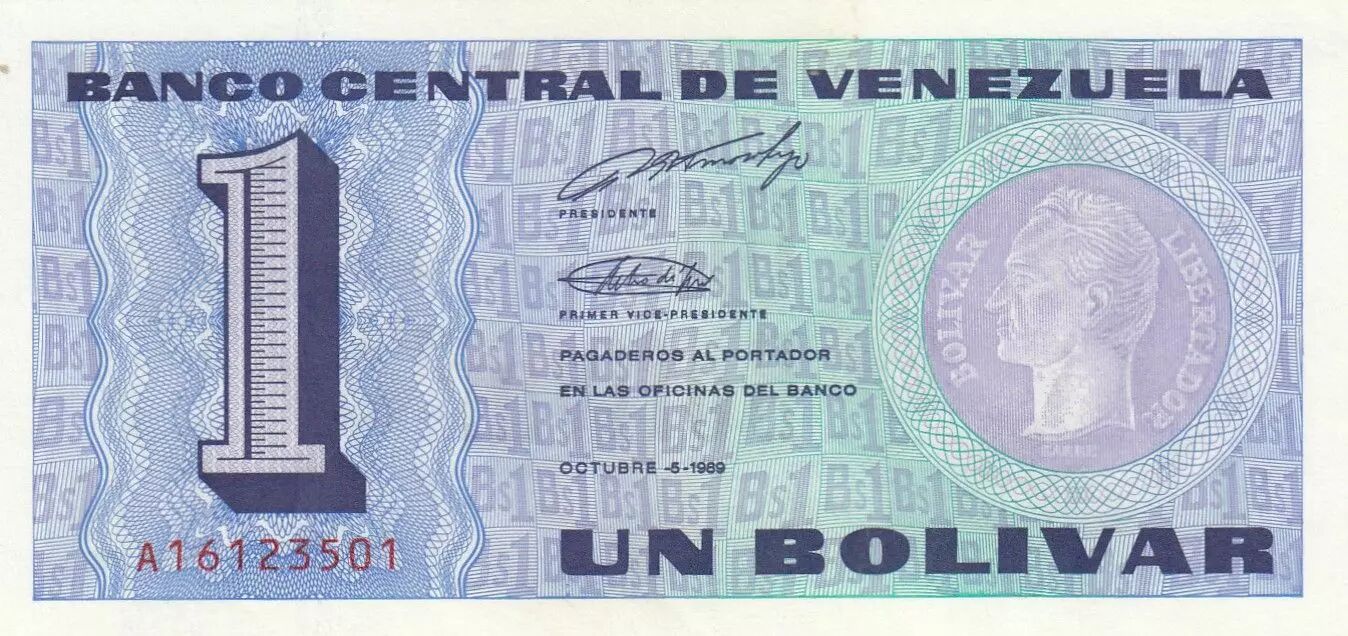 The face value of the note is clearly indicated, representing one unit of the Venezuelan currency, the bolivar. The year of issue, 1989, is important information for collectors and historians as it places the note in a specific economic and political context of Venezuela.