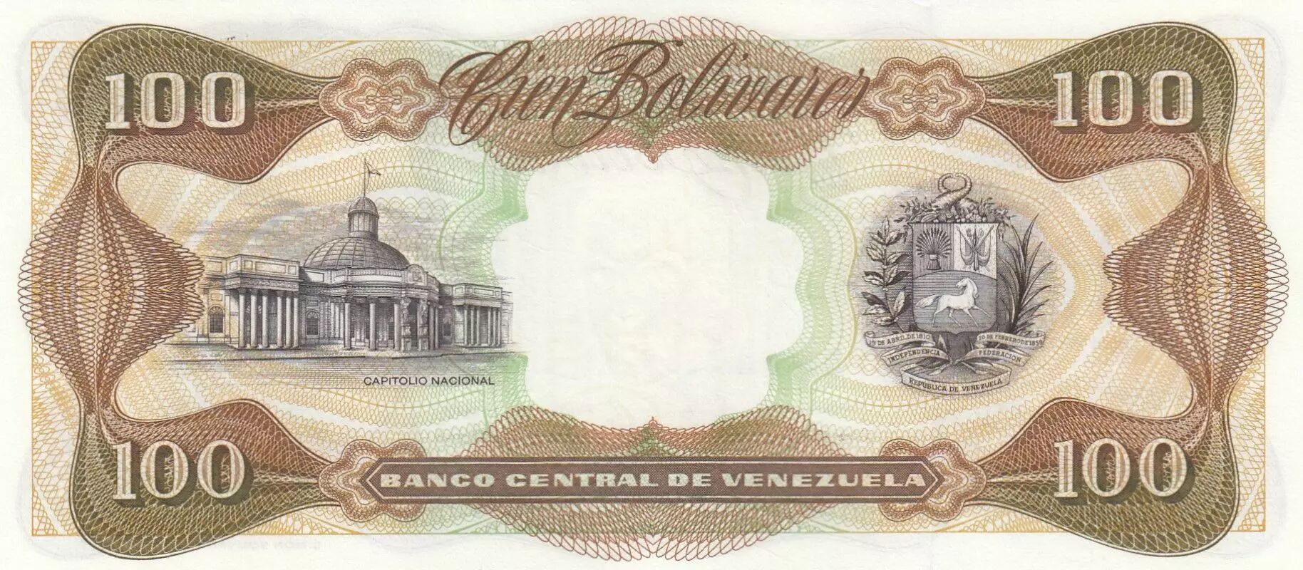 The reverse of the banknote repeats the brown motif on a yellow background. The National Capitol is depicted on the left, while the coat of arms of Venezuela appears on the right. The watermark area is located in the center. The denomination in words, "CIEN BOLÍVARES", is written at the top, and the name of the issuer, "BANCO CENTRAL DE VENEZUELA", is repeated at the bottom. The nominal value "100" is present in each corner.