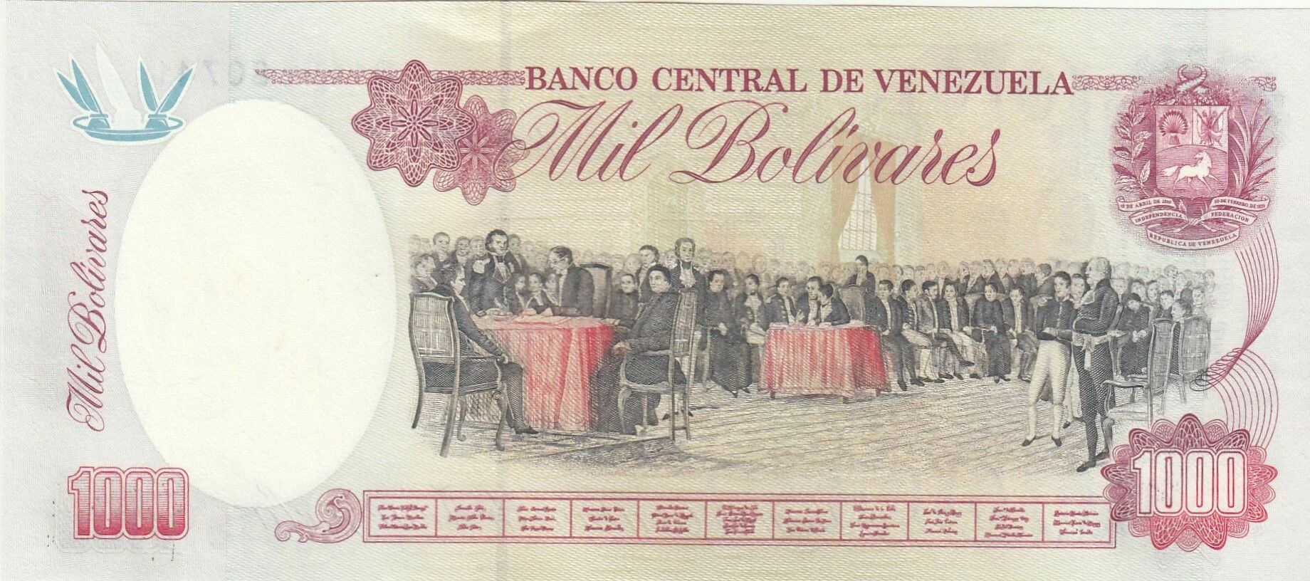 On the front, the banknote features a portrait of Simón Bolívar, an emblematic figure of the independence of several South American countries. The text "Banco Central de Venezuela" is also present, indicating the issuing institution. The face value "1000" is repeated in several places, accompanied by the mention "Mil Bolívares."