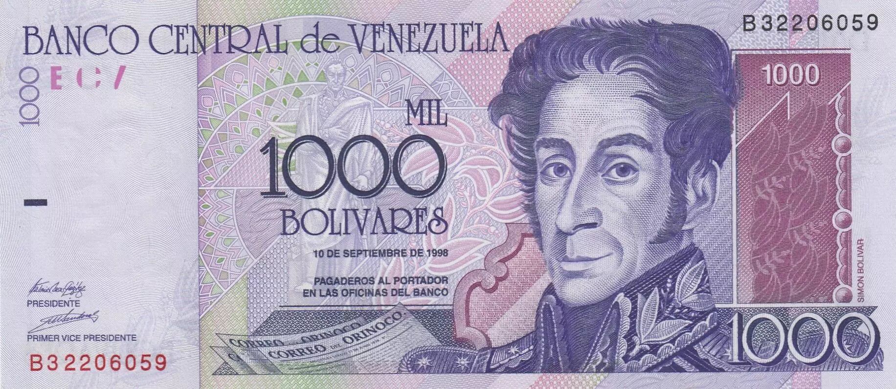 The mention of the issuing institution, the Banco Central de Venezuela, appears at the top of the banknote. The face value of 1000 bolivares is indicated in numbers in the upper corners and bottom right, as well as in words in the center of the banknote. The date of issue, September 10, 1998, is printed below the face value. The signatures of the president and the first vice-president of the central bank are affixed under the mention "PAGADEROS AL PORTADOR". A watermark is positioned to the left of Bolívar's portrait, while a tactile mark for the visually impaired is located in the center left. The serial numbers, preceded by a letter, are printed in red at the bottom left and in black at the top right.