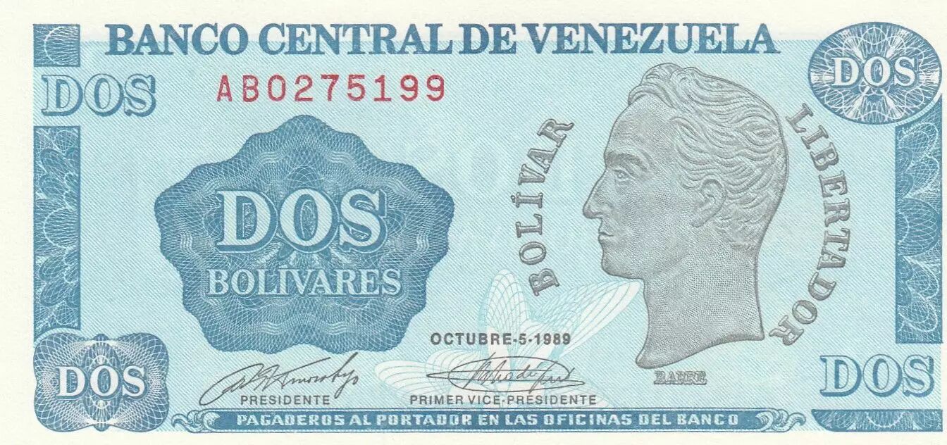 Ce billet de banque vénézuélien, d'une valeur nominale de 2 bolivares, a été émis en 1989. Il appartient à la série AB. Ses dimensions sont de 115 mm de longueur sur 55 mm de largeur.