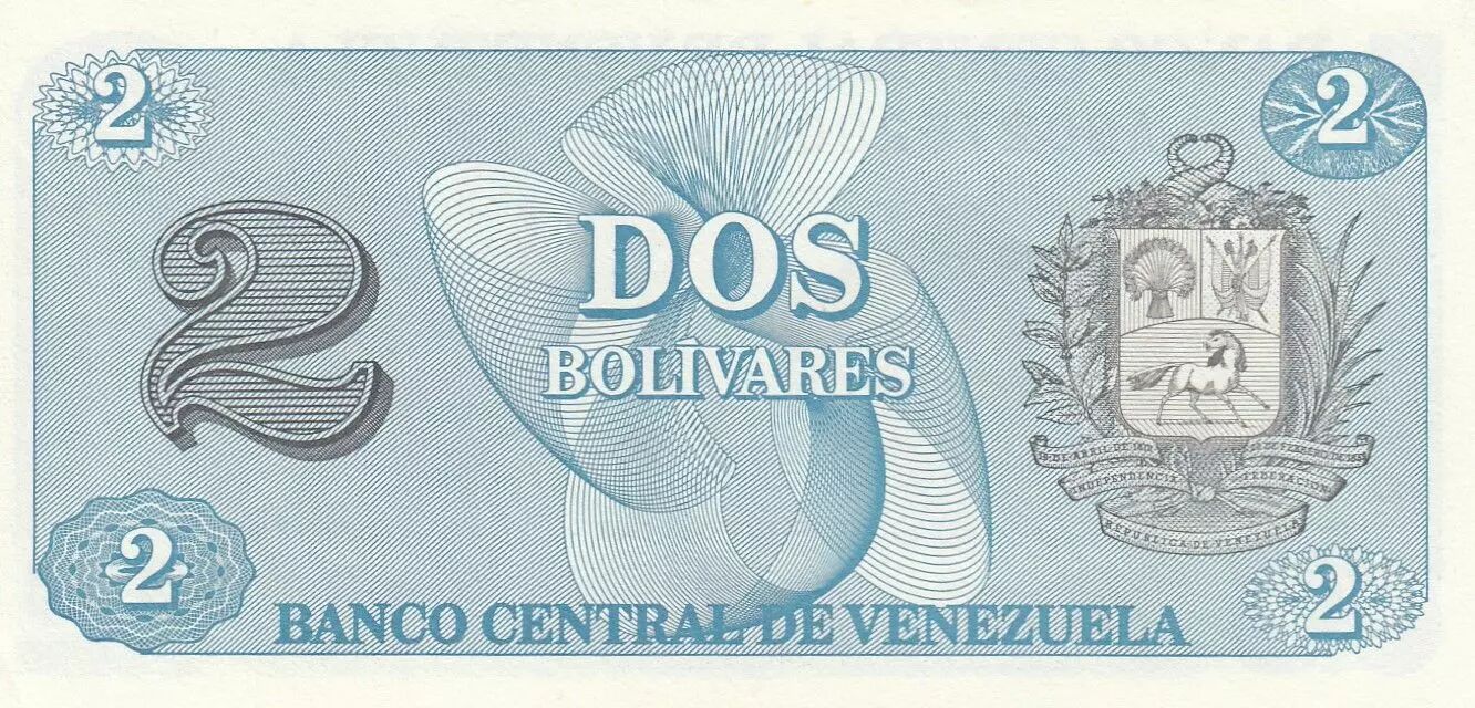 Le verso du billet arbore un motif en gris et blanc sur un fond cyan foncé. Au centre, la valeur nominale "DOS BOLÍVARES" est mise en évidence. Les armoiries du Venezuela sont représentées sur la droite, tandis que la valeur "2" est inscrite sur la gauche. Le nom de l'émetteur, "BANCO CENTRAL DE VENEZUELA", est répété en bas. La valeur "2" est également présente dans chaque coin du billet.