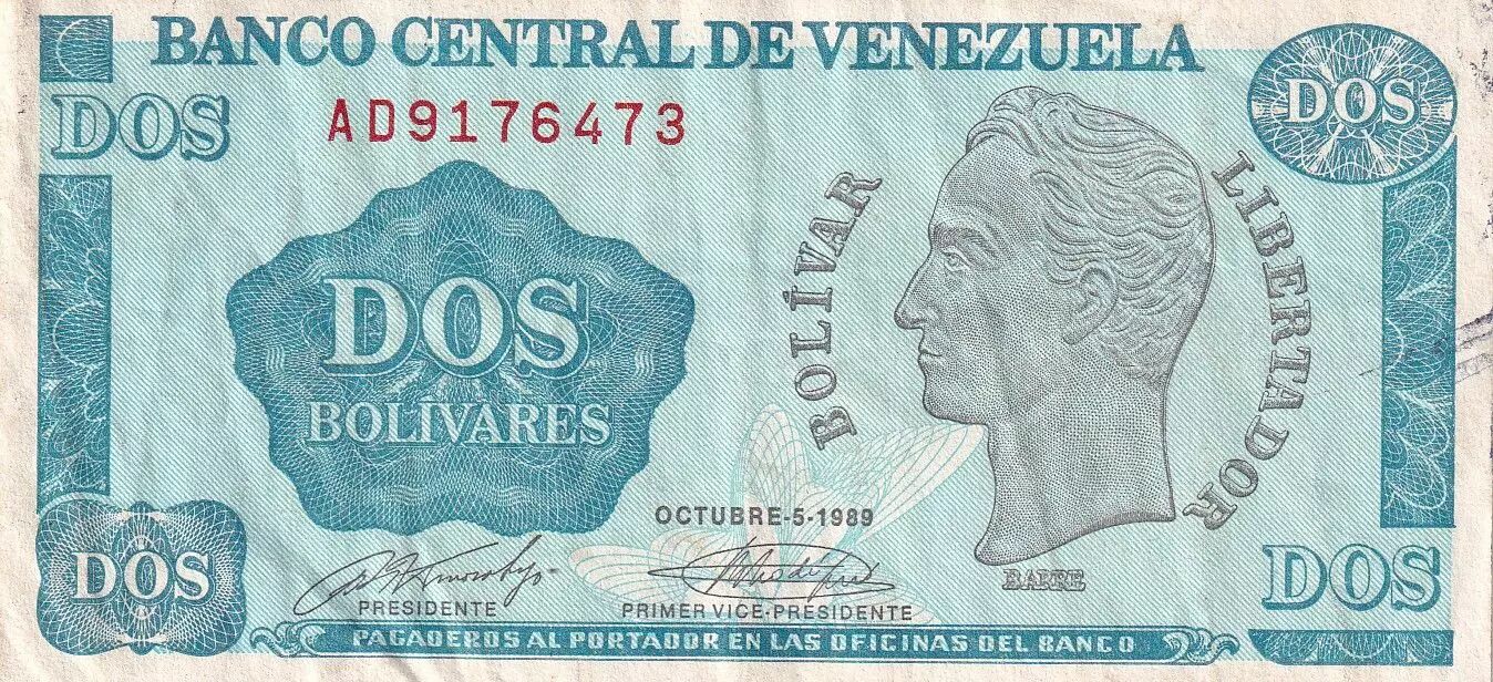 Home > > Venezuela 2 Bolivares - Simon Bolivar - Arms - 1989 - Serial AD - P.69