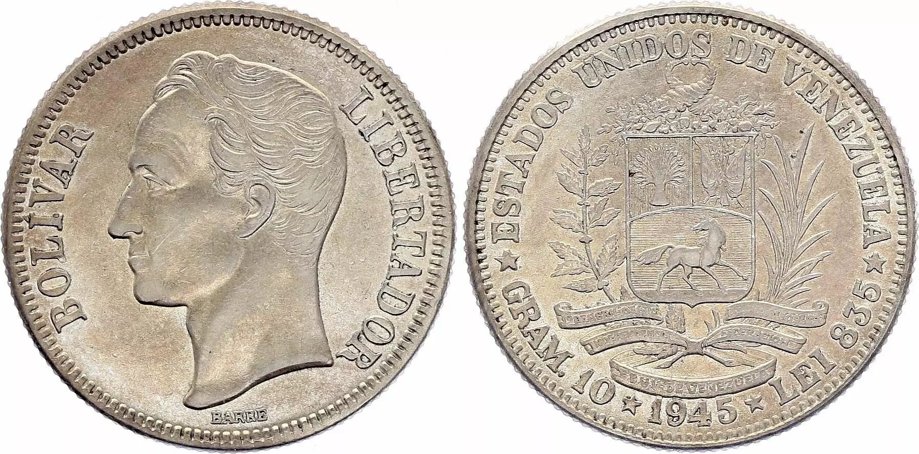 Home > > Venezuela 2 Bolivares, Simon Bolivar - Arms - Gram 10 - 1945
