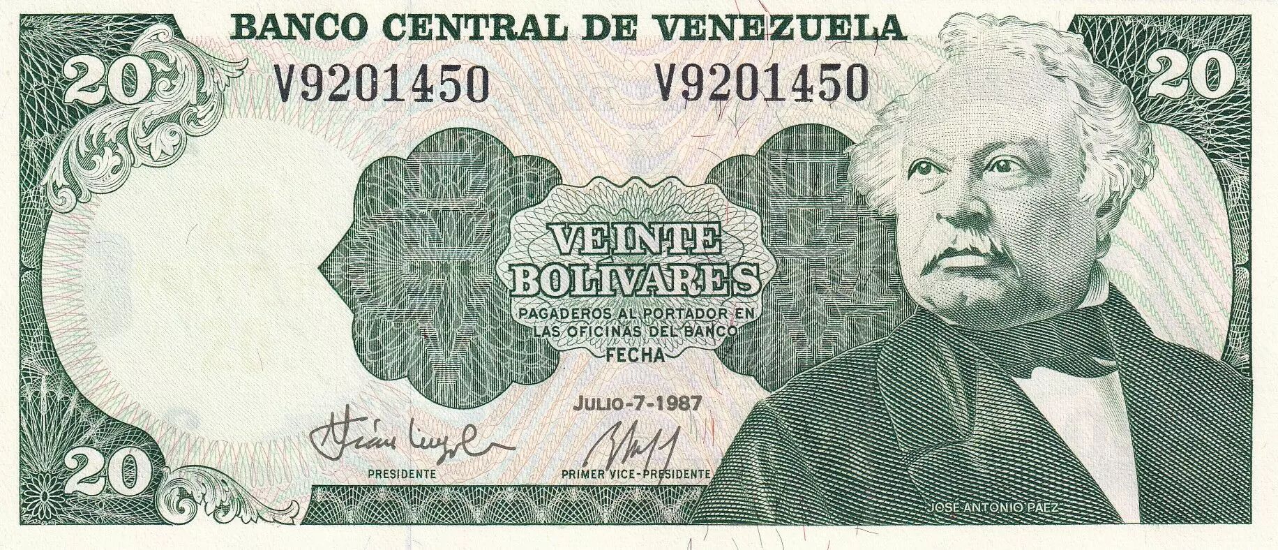 Home > World Banknotes > American Banknotes > Venezuela > Venezuela 20 Bolivares - José Antonio Paez - 07-07-1987 - Letter V