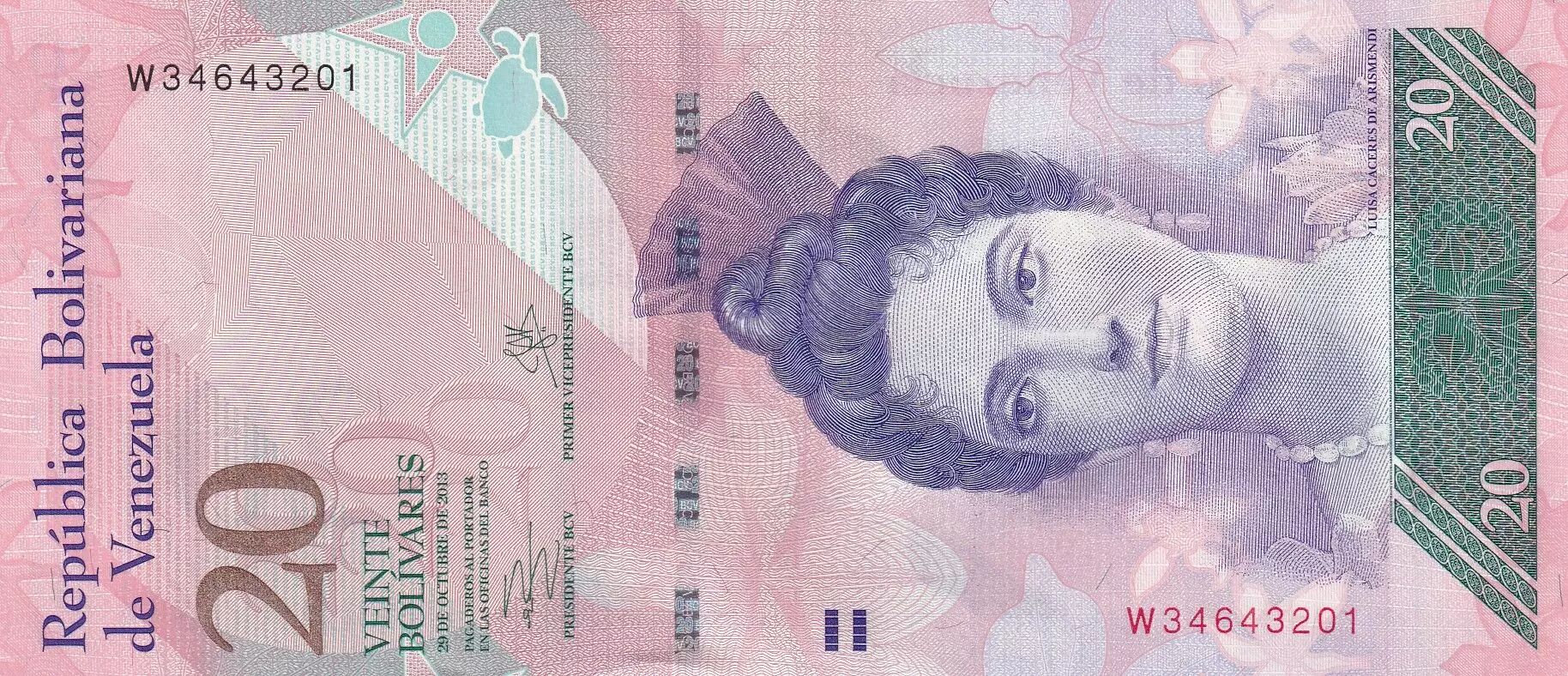 Banknote Venezuela 20 Bolivares, Luisa Caceres de Artsmendi - Tortles - 29-10-2013 - Letter W