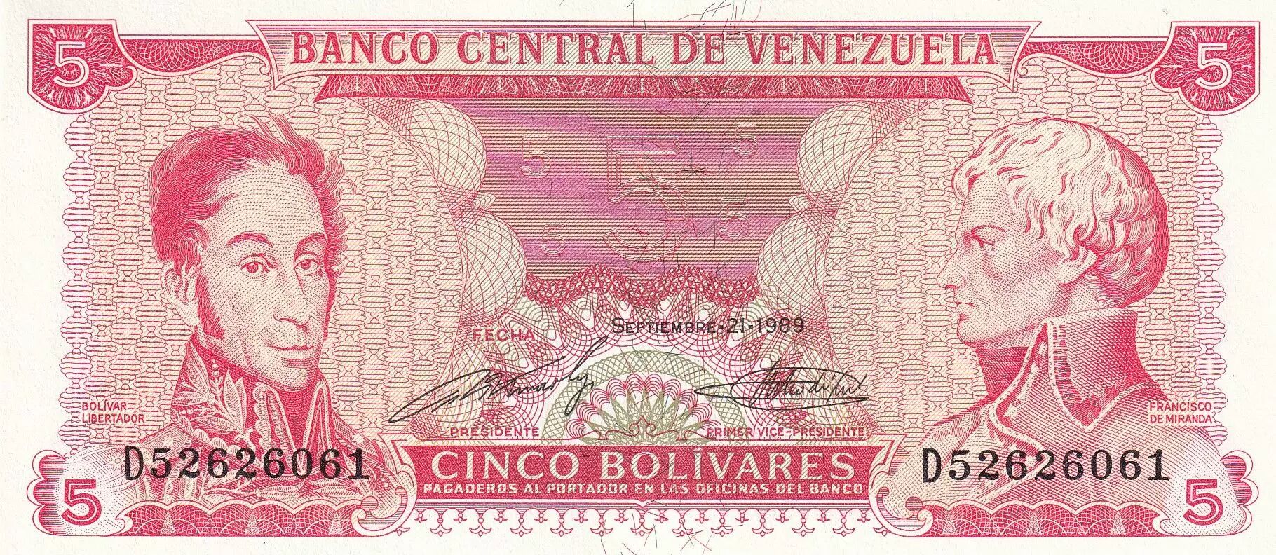 Billet Venezuela 5 Bolivares - Simon Bolivar - F de Miranda - 1989 - Série D - P.70b