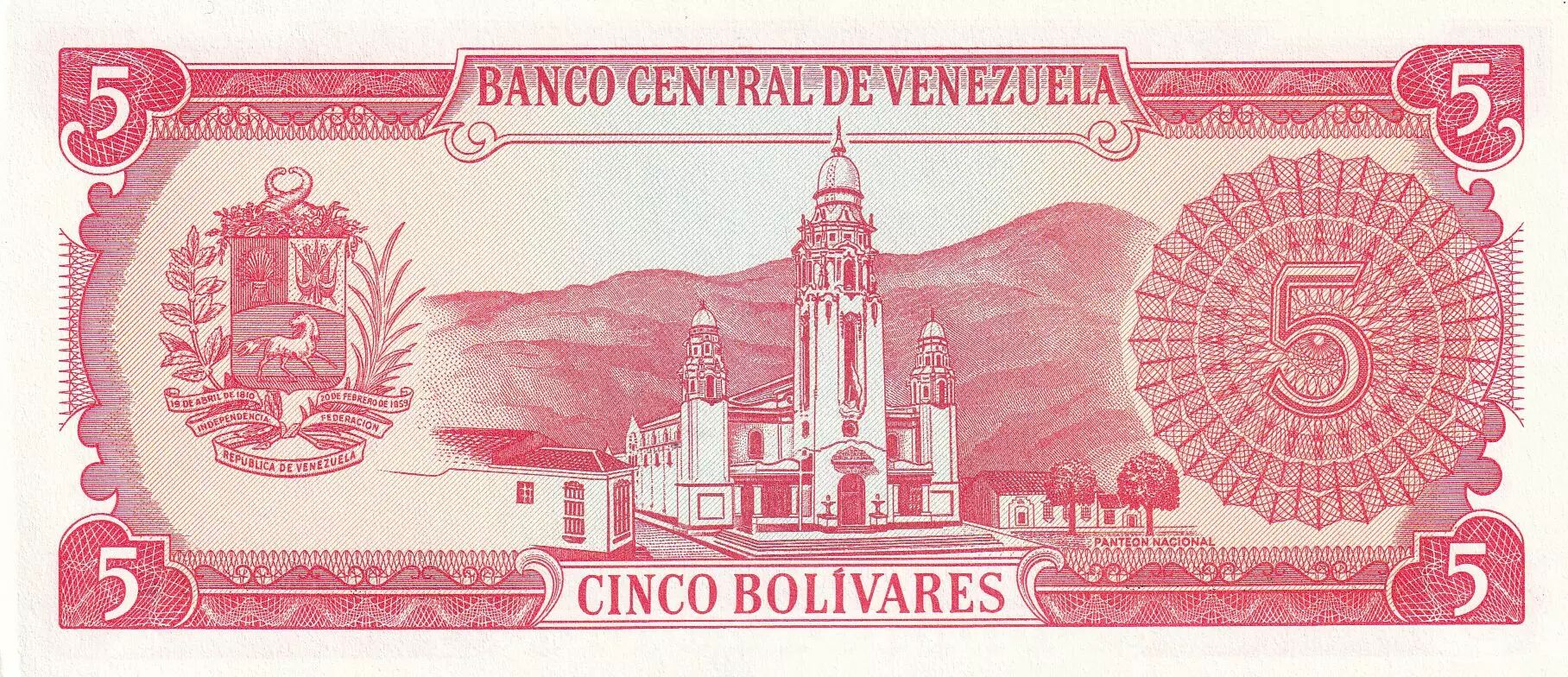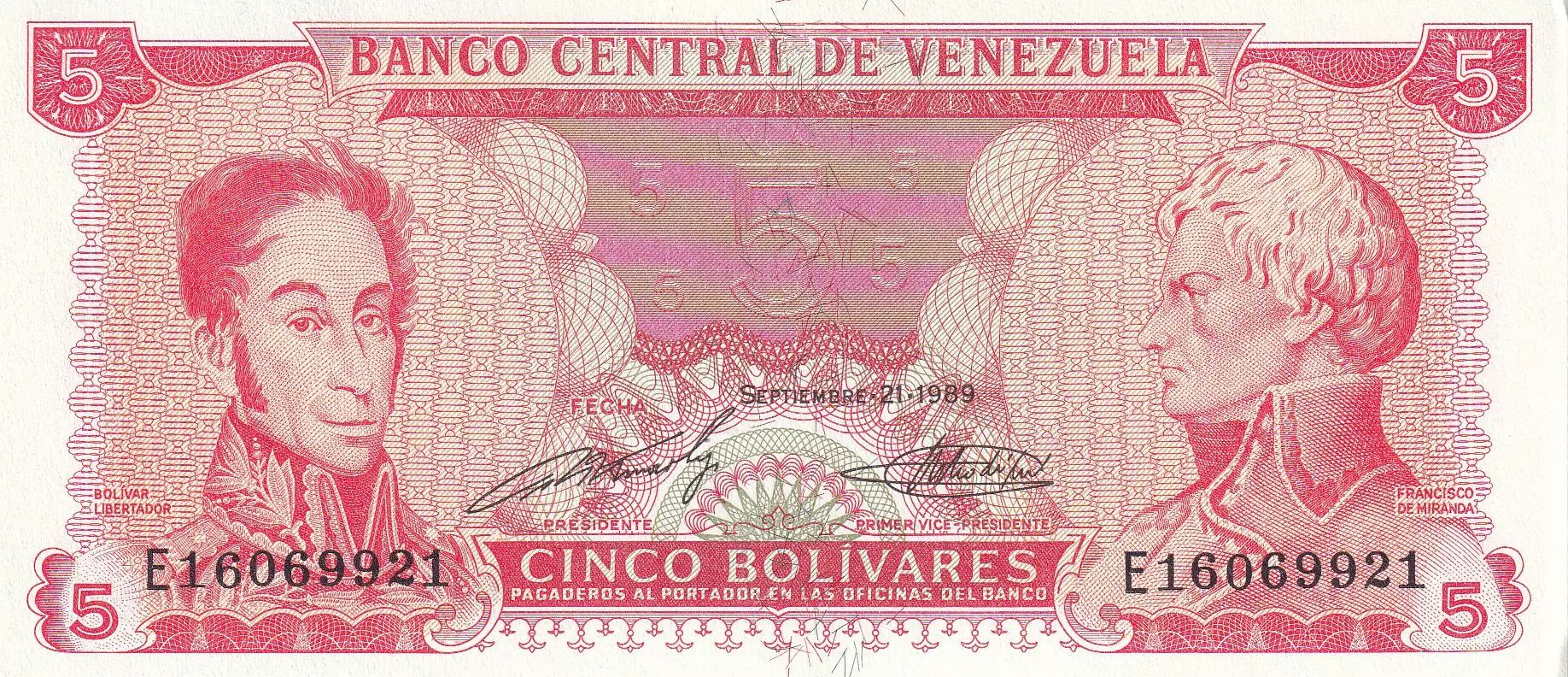 Billet Venezuela 5 Bolivares - Simon Bolivar - F de Miranda - 1989 - Série E - P.70b