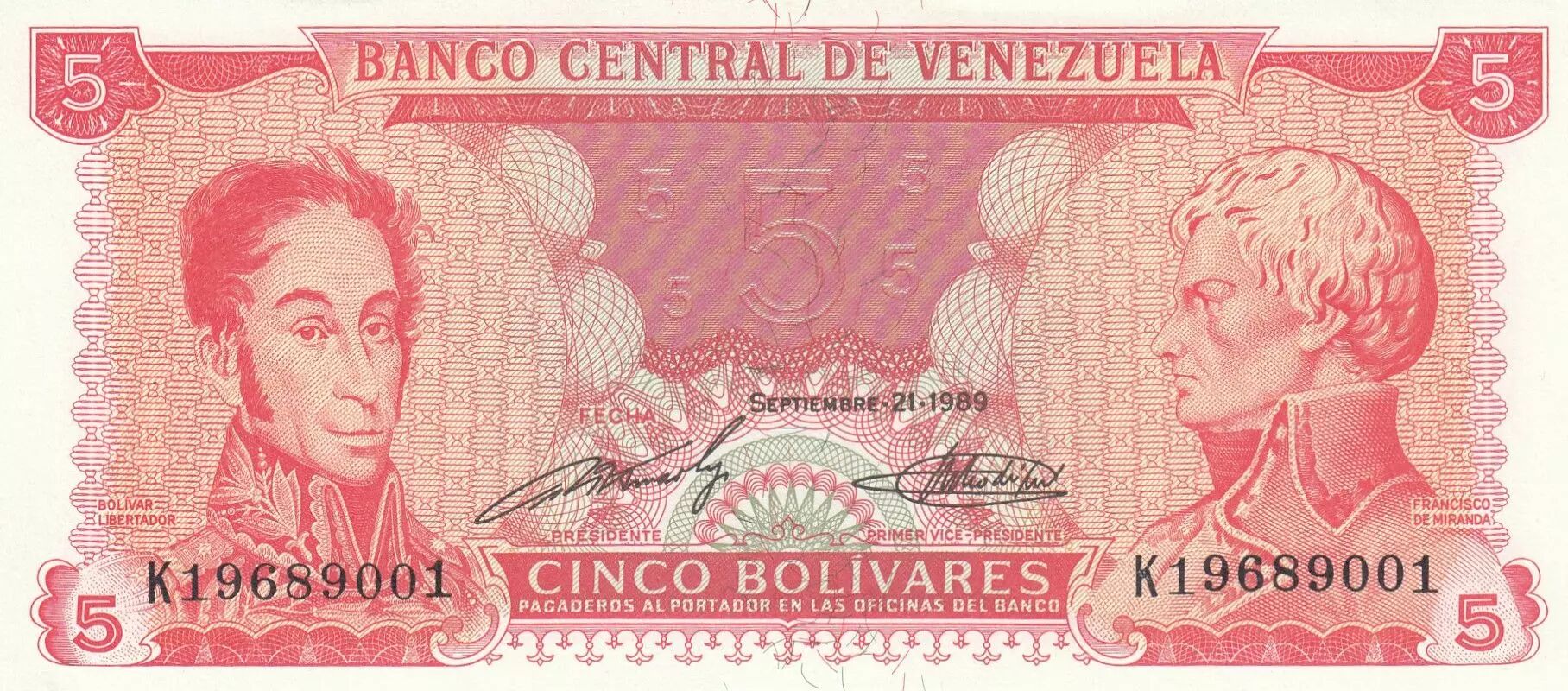 Ce billet de banque vénézuélien a été émis en 1989. Il possède une valeur nominale de cinq bolivares. Le billet mesure 156 millimètres de long et 69 millimètres de large.