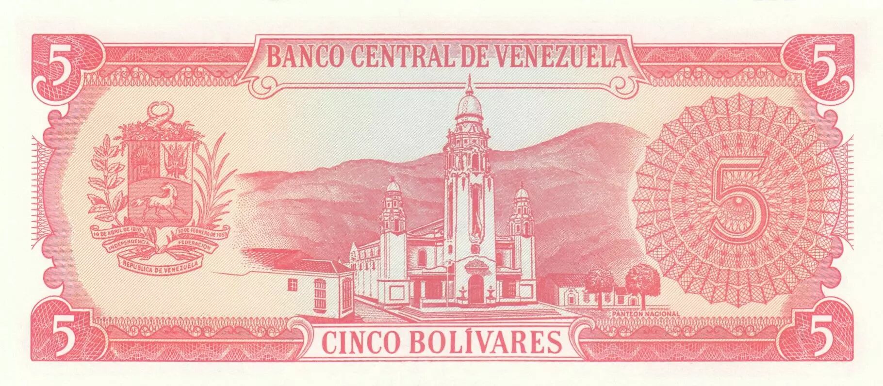Le verso du billet présente une illustration du Panthéon national du Venezuela, situé au centre. La valeur nominale, "5", est répétée dans les coins de la bordure.