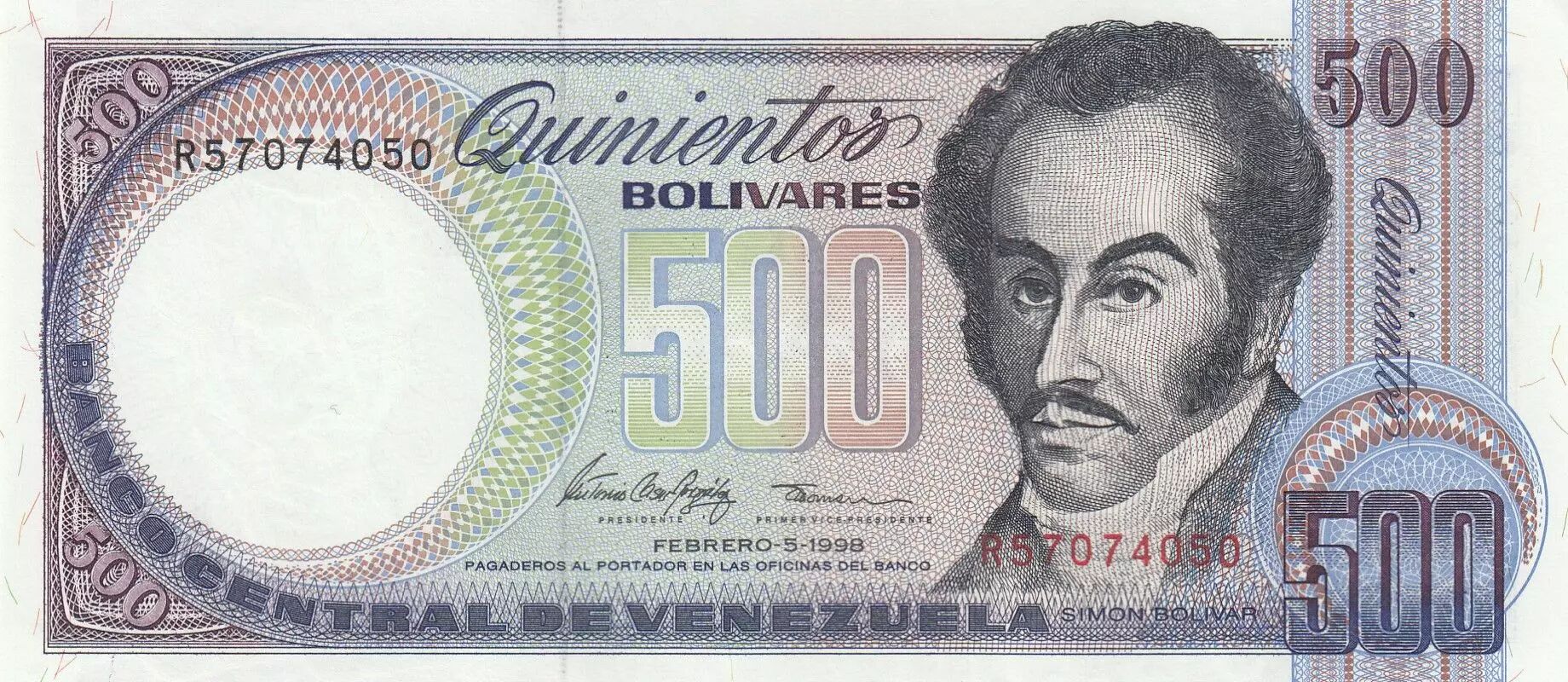 This Venezuelan banknote has a face value of 500 bolivares. It was issued on February 5, 1998 and belongs to series R.