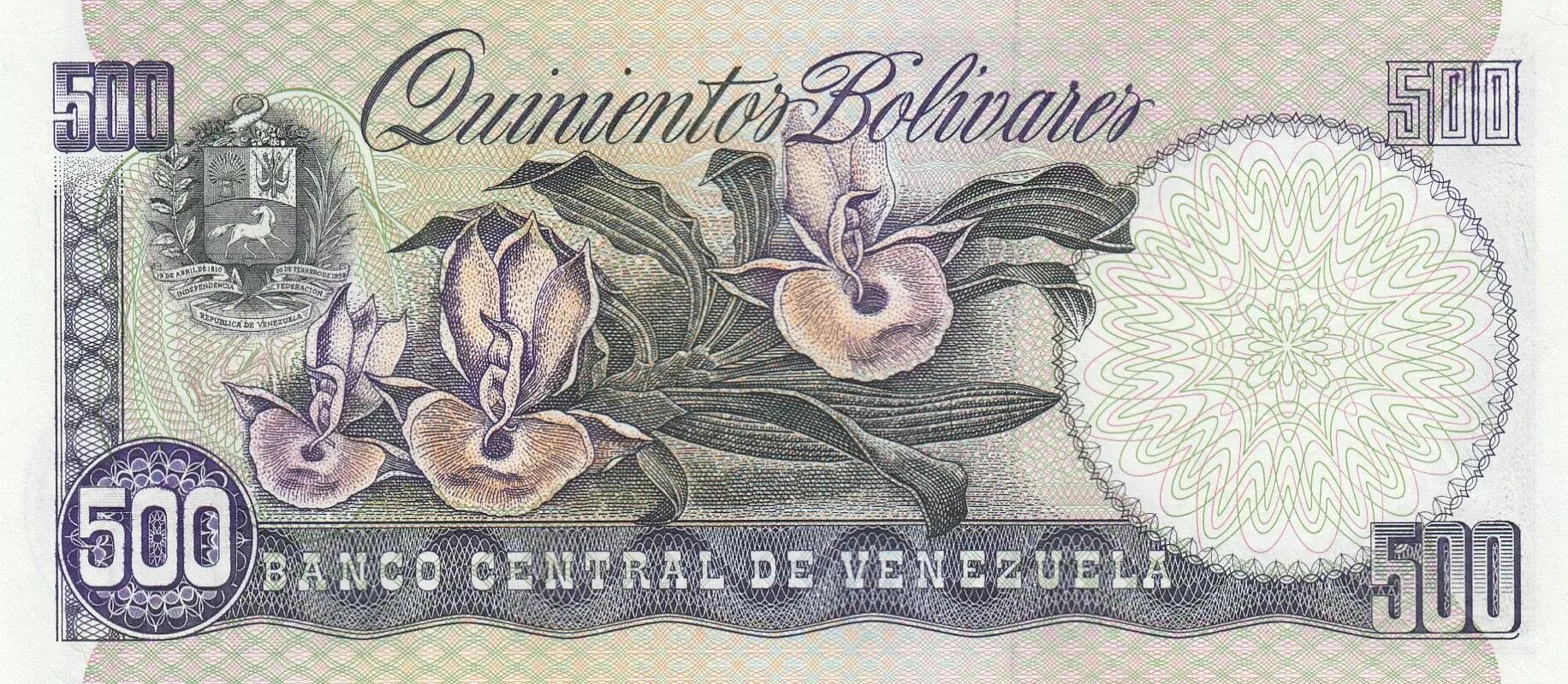The back of the banknote features a floral design. This floral decoration may include botanical elements native to Venezuela, adding a cultural and aesthetic dimension to the banknote's design. The specific details of the flowers depicted may vary, but they contribute to the overall visual identity of the banknote.