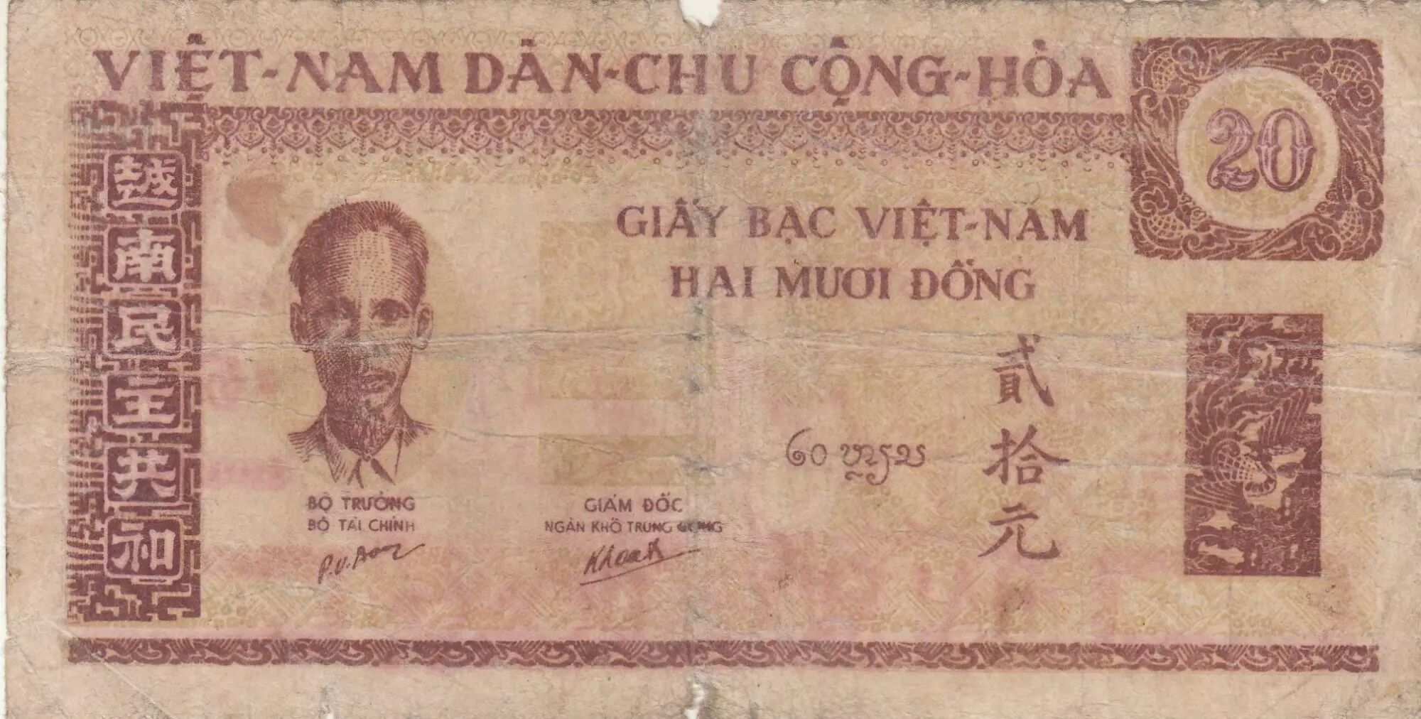 The 20 ??ng banknote of Vietnam, issued under the Democratic Republic of Vietnam, measures 170 × 88 mm and is distinguished by a dark red and gold print, richly decorated with ornamental motifs. On its obverse, the portrait of H? Chí Minh is depicted frontally, slightly turned to the left, while a phoenix appears on the right. Inscriptions appear in Lao, Traditional Chinese, and Vietnamese, reflecting the linguistic diversity of the region at that time. Official mentions include "VI?T-NAM DÂN-CH? C?NG-HOÀ", "GI?Y B?C VI?T-NAM", "HAI M??I ??NG" as well as their equivalents in Chinese characters "??????" and "???". The signatures of the Minister of Finance and the Director of the Central Treasury appear below the portrait.