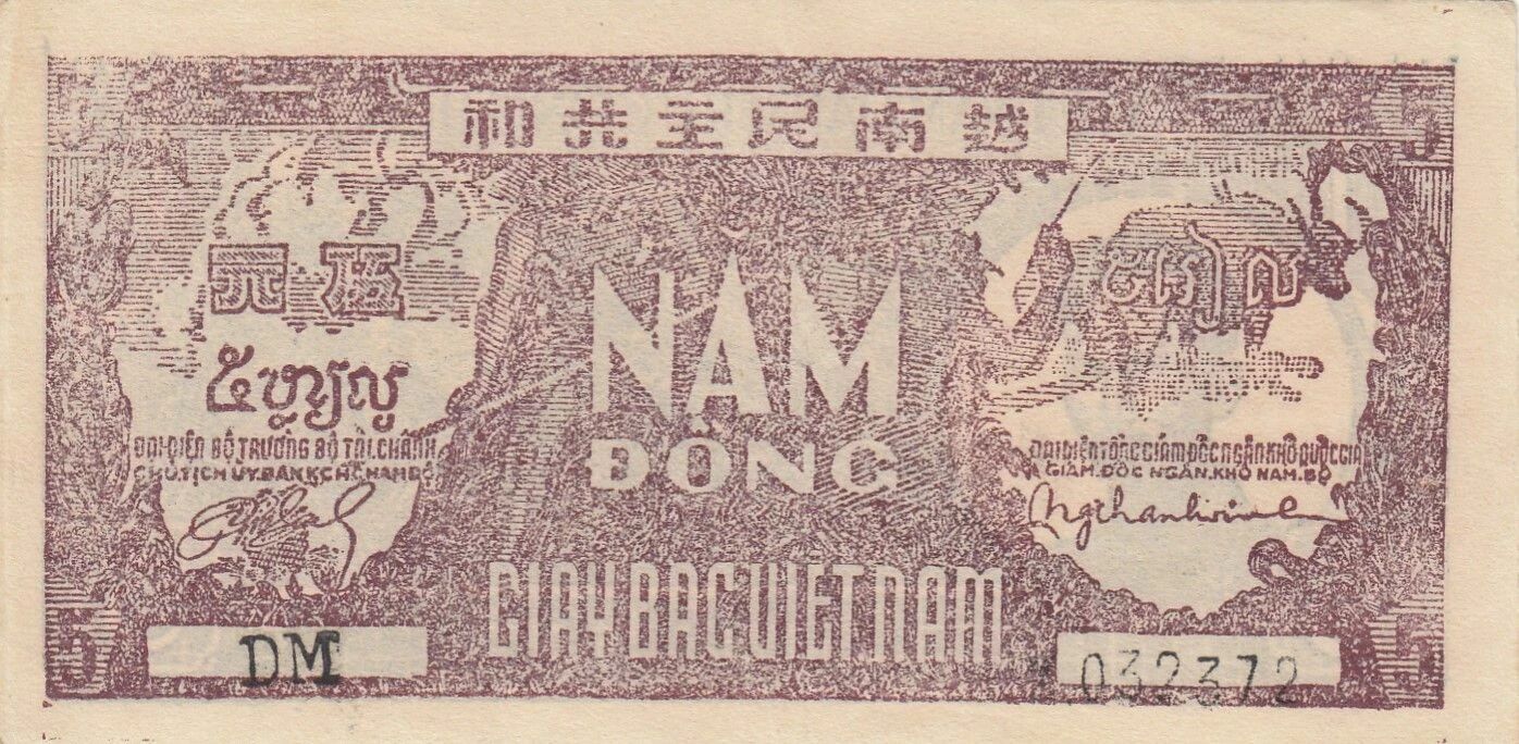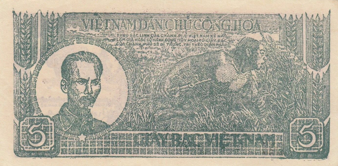 This banknote, with a face value of 5 dongs, was issued in Vietnam in 1948. It falls into the category of banknotes and testifies to a specific period in Vietnamese monetary history.