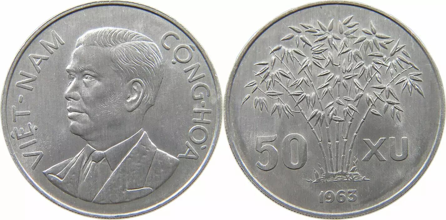 The 50 Xu coin, dating from 1963, is struck in aluminum. It weighs 3.1 grams and has a diameter of 30 millimeters. This coin was issued in the name of Ngo Dinh Diem.