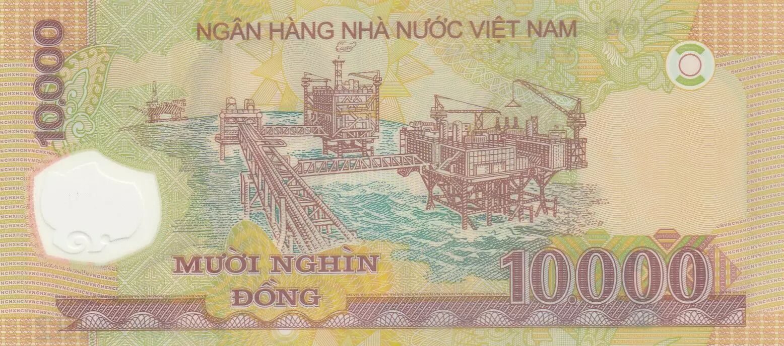 Le revers du billet illustre le champ pétrolifère de Bach Ho, une importante zone d'extraction pétrolière au Vietnam. La mention "Ngân hàng nhà n??c Vi?t Nam" (Banque d'État du Vietnam) y figure également, ainsi que la dénomination "M??i nghìn ??ng". L'écriture est aussi en latin.