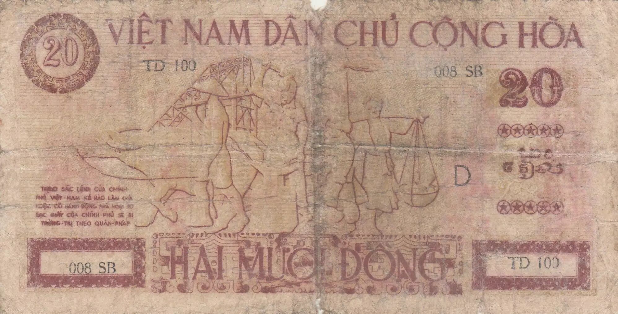 Le billet de 20 ??ng du Viêt Nam, émis sous la République Démocratique du Viêt Nam, mesure 170 × 88 mm et se distingue par une impression rouge foncé et or, richement décorée de motifs ornementaux. Sur son recto, le portrait de H? Chí Minh est représenté de face, légèrement tourné vers la gauche, tandis qu?un phénix apparaît à droite. Les inscriptions figurent en lao, chinois traditionnel et vietnamien, traduisant la diversité linguistique de la région à cette époque. Les mentions officielles comprennent « VI?T-NAM DÂN-CH? C?NG-HOÀ », « GI?Y B?C VI?T-NAM », « HAI M??I ??NG » ainsi que leurs équivalents en caractères chinois « ?????? » et « ??? ». Les signatures du ministre des Finances et du directeur du Trésor central apparaissent sous le portrait.
