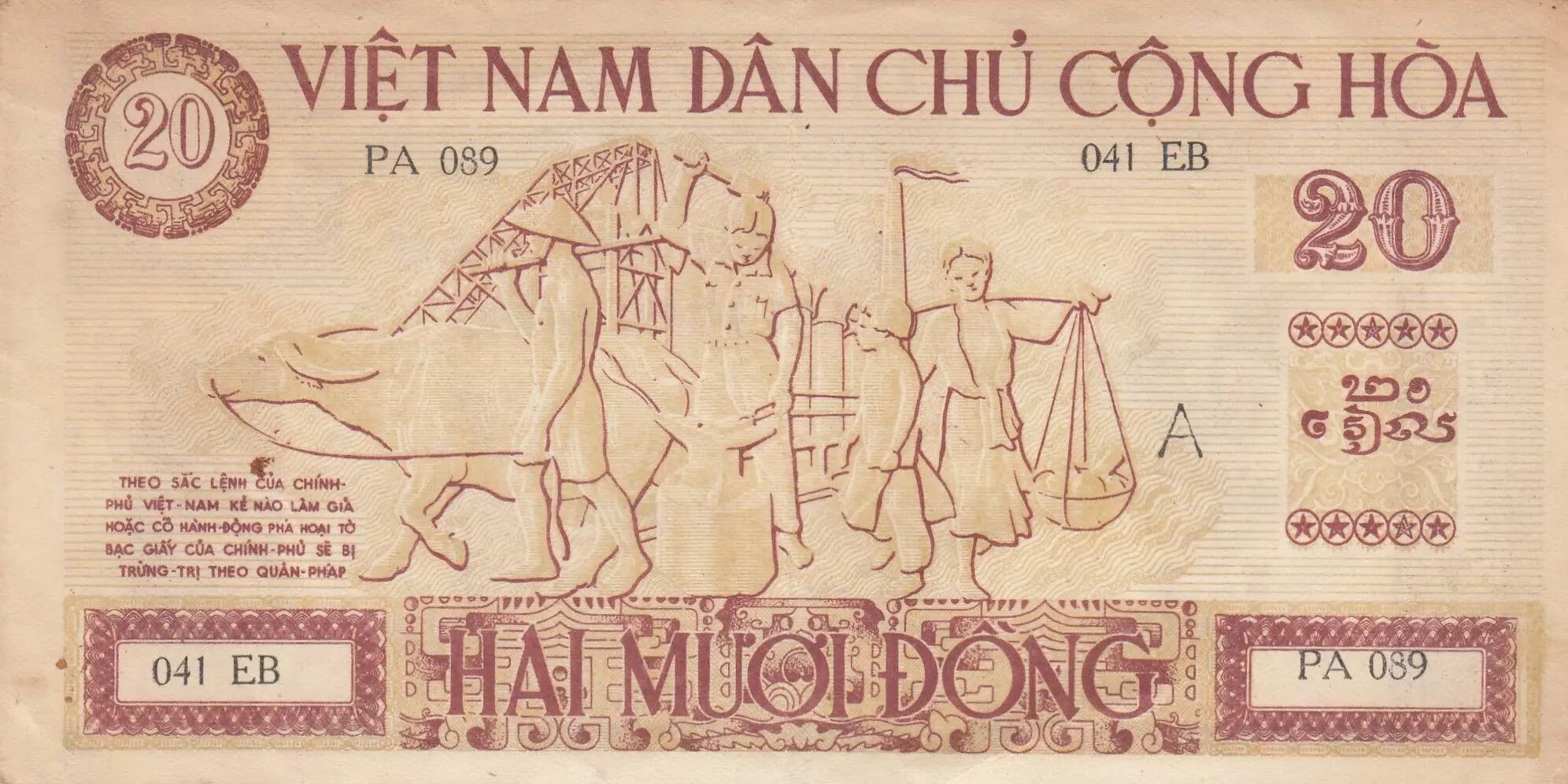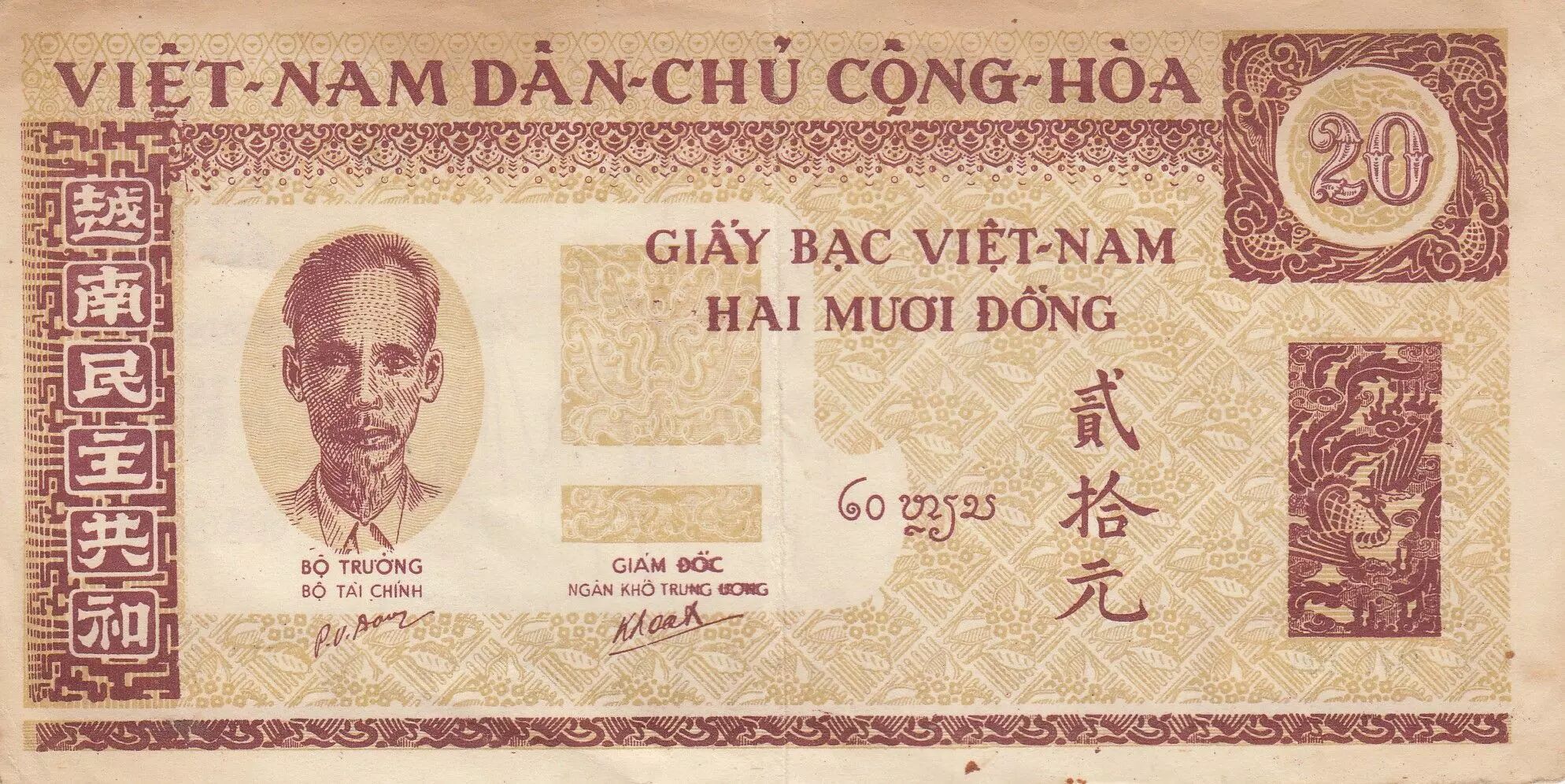 Le billet de 20 ??ng du Viêt Nam, émis sous la République Démocratique du Viêt Nam, mesure 170 × 88 mm et se distingue par une impression rouge foncé et or, richement décorée de motifs ornementaux. Sur son recto, le portrait de H? Chí Minh est représenté de face, légèrement tourné vers la gauche, tandis qu?un phénix apparaît à droite. Les inscriptions figurent en lao, chinois traditionnel et vietnamien, traduisant la diversité linguistique de la région à cette époque. Les mentions officielles comprennent « VI?T-NAM DÂN-CH? C?NG-HOÀ », « GI?Y B?C VI?T-NAM », « HAI M??I ??NG » ainsi que leurs équivalents en caractères chinois « ?????? » et « ??? ». Les signatures du ministre des Finances et du directeur du Trésor central apparaissent sous le portrait.
