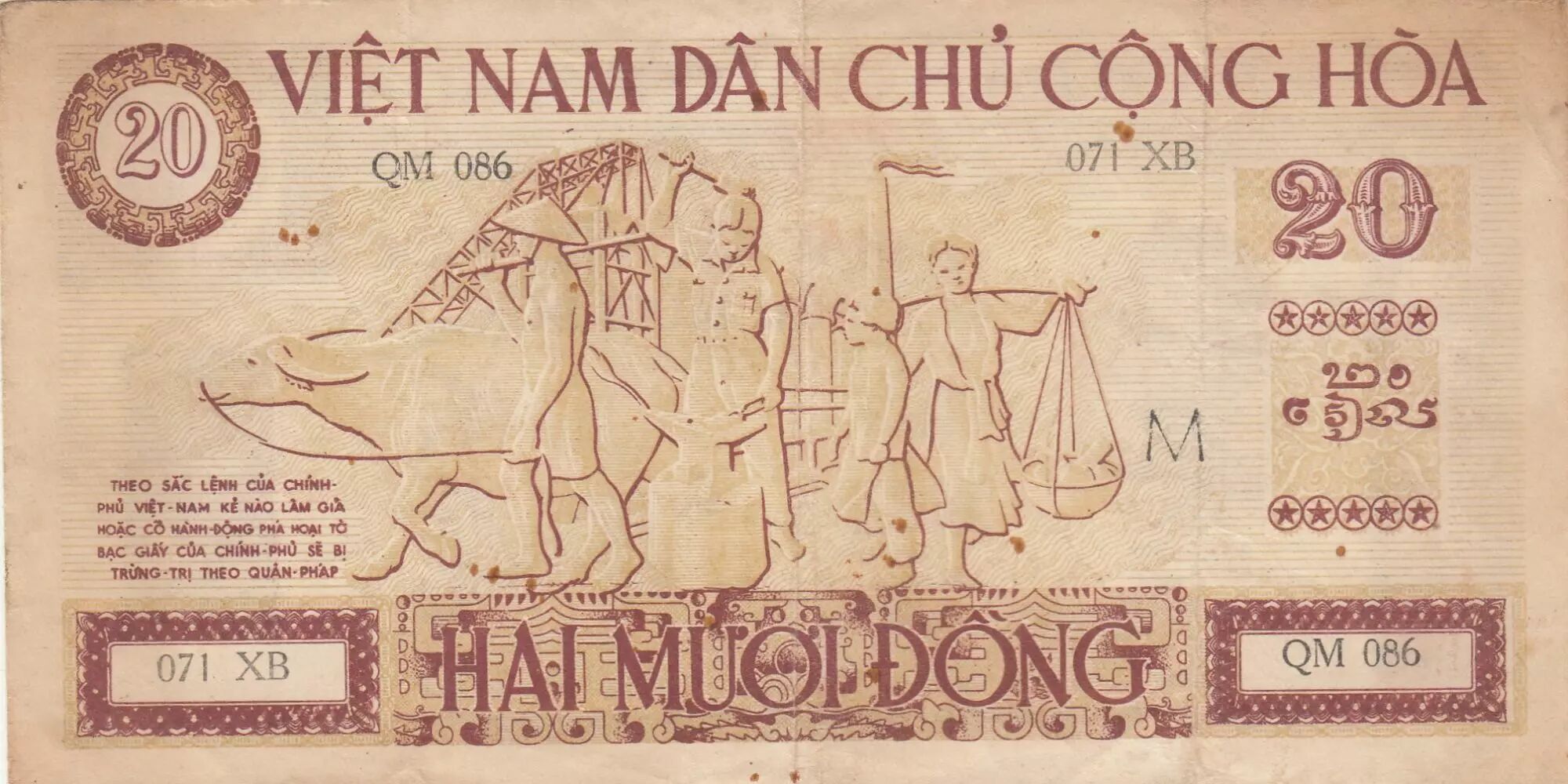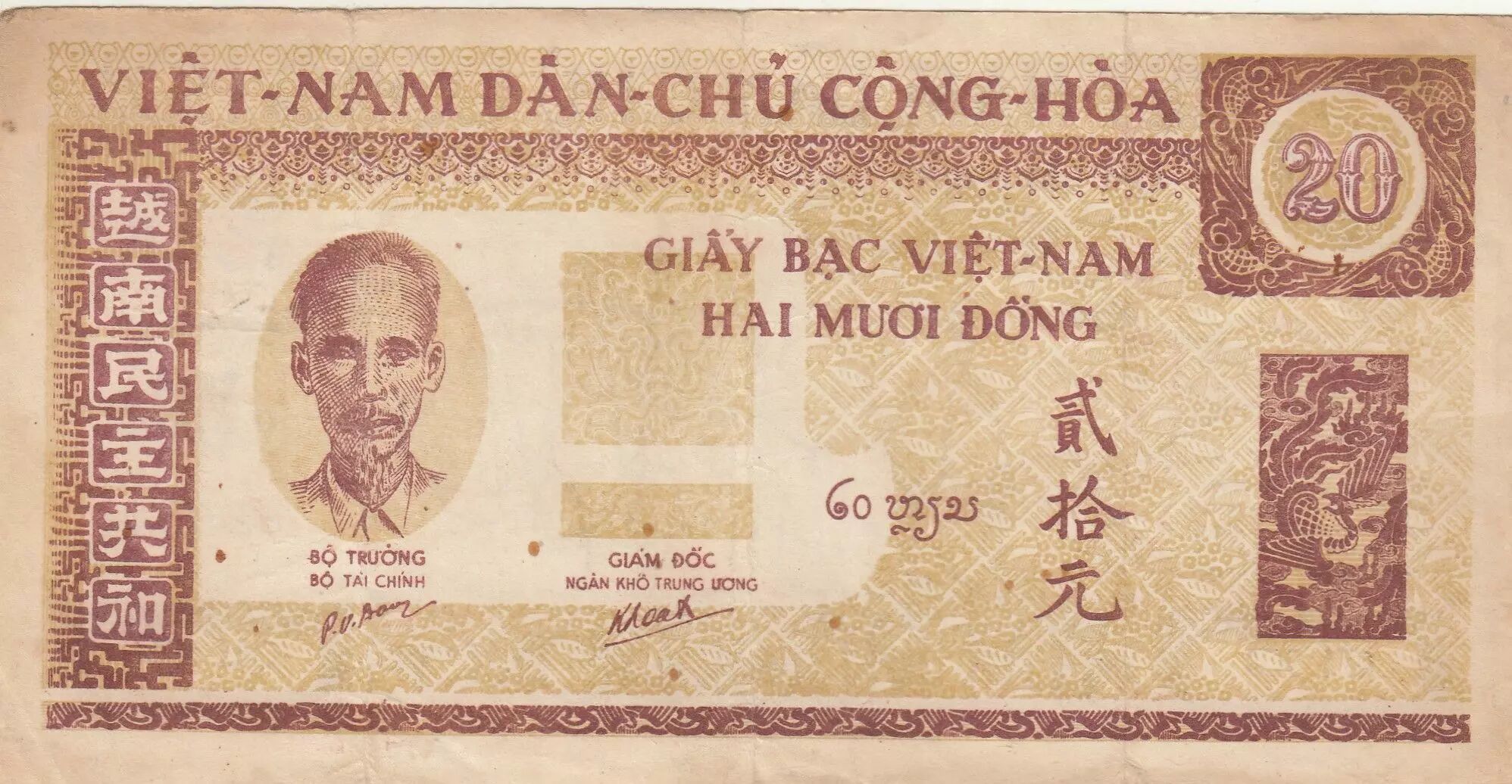Le billet de 20 ??ng du Viêt Nam, émis sous la République Démocratique du Viêt Nam, mesure 170 × 88 mm et se distingue par une impression rouge foncé et or, richement décorée de motifs ornementaux. Sur son recto, le portrait de H? Chí Minh est représenté de face, légèrement tourné vers la gauche, tandis qu?un phénix apparaît à droite. Les inscriptions figurent en lao, chinois traditionnel et vietnamien, traduisant la diversité linguistique de la région à cette époque. Les mentions officielles comprennent « VI?T-NAM DÂN-CH? C?NG-HOÀ », « GI?Y B?C VI?T-NAM », « HAI M??I ??NG » ainsi que leurs équivalents en caractères chinois « ?????? » et « ??? ». Les signatures du ministre des Finances et du directeur du Trésor central apparaissent sous le portrait.