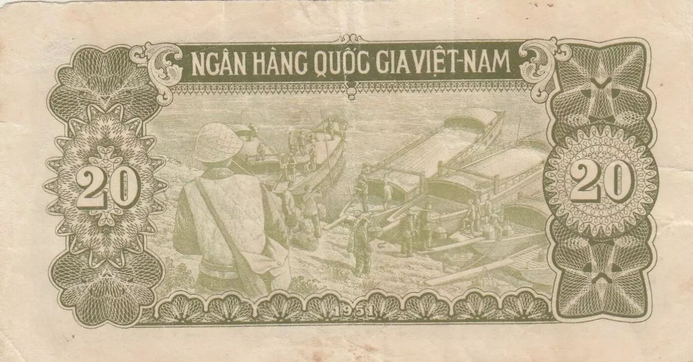 Ce billet de banque de 20 dong, émis en 1951, provient du Vietnam. Il s'inscrit dans la série AB et témoigne d'une époque spécifique de l'histoire monétaire vietnamienne. Le recto du billet met en avant le portrait de Hô Chi Minh, figure emblématique du Vietnam et militant communiste devenu Président du pays. Son image est un symbole fort de l'histoire et de l'identité nationale vietnamienne. La valeur nominale de "20" est clairement indiquée à deux reprises, accompagnée de la mention "HAI MUOI DONG", qui signifie "vingt dong" en vietnamien. L'inscription "VIET NAM DAN CHU CONG HOA" figure également sur le recto, signifiant "République Démocratique du Vietnam".