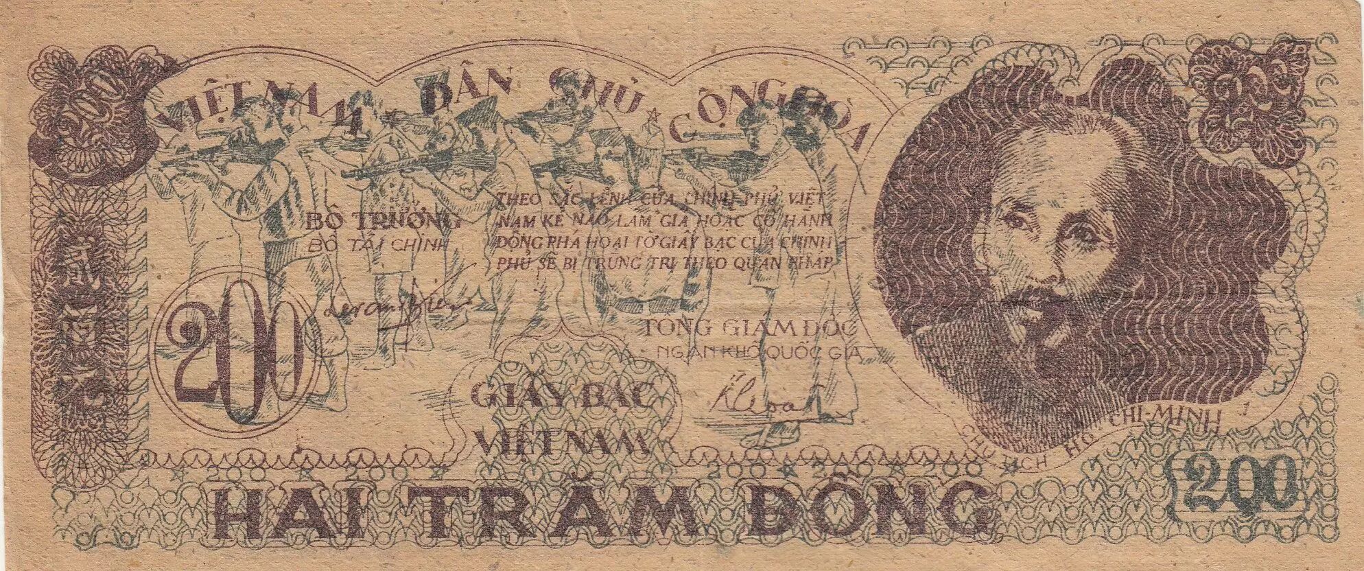 Ce billet de banque est émis par le Vietnam et présente une valeur nominale de 200 dongs. Sa date d'émission remonte à l'année 1950.
