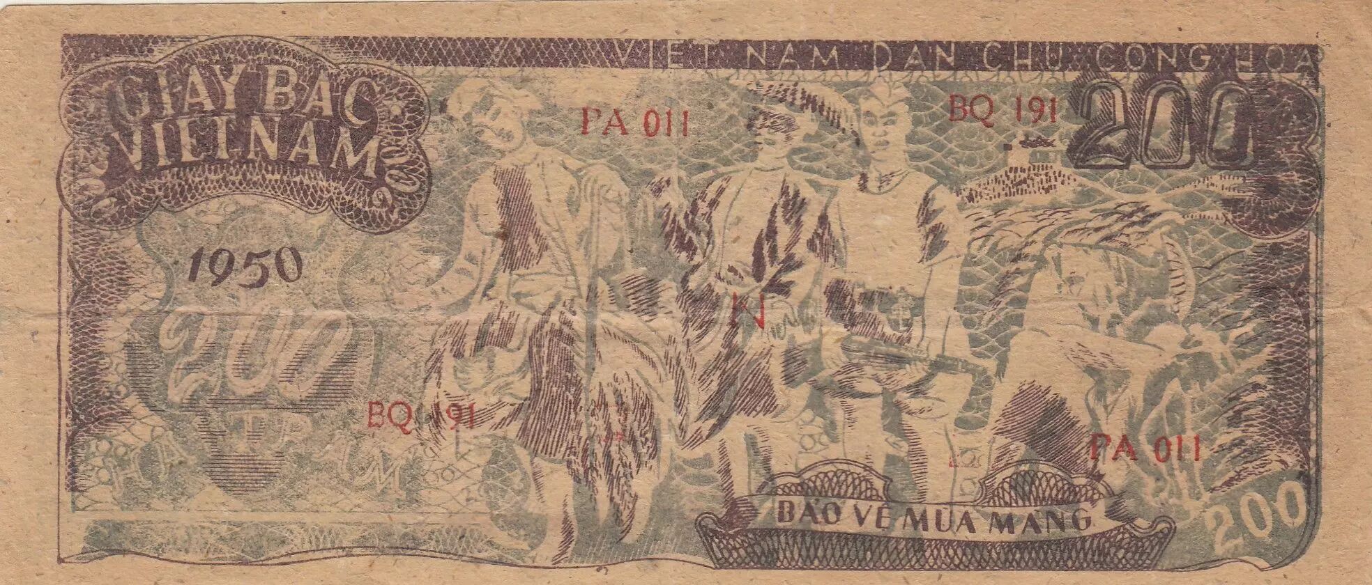 En résumé, ce billet de 200 dongs, émis en 1950, se distingue par le portrait de Hô Chi Minh sur son recto et par ses dimensions caractéristiques. Son appartenance à la série "PA 011 - BQ 191" constitue un élément d'identification supplémentaire.