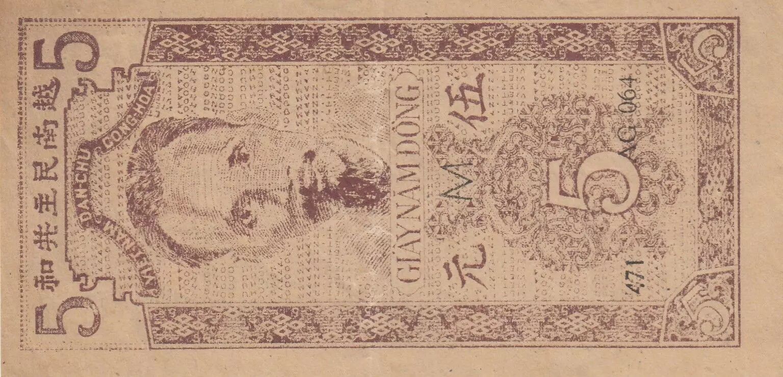 Ce billet de banque est une coupure de 5 dongs émise en 1947 par l'institut d'émission du Vietnam. Il fait partie d'une série identifiée par le code "AG 064".